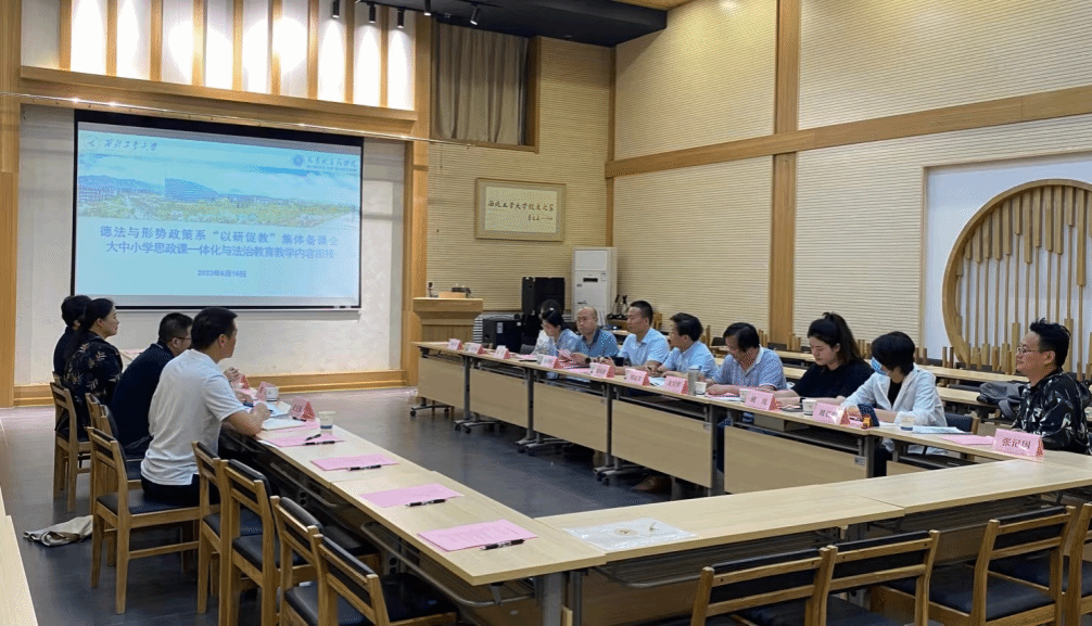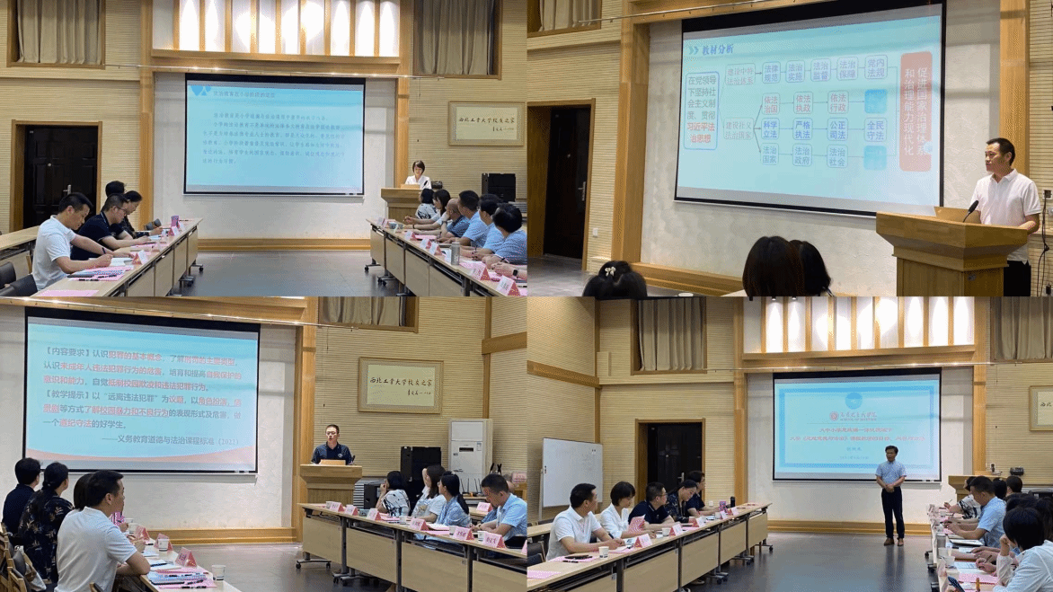 本次备课会围绕法治教育内容与思政课的有效衔接展开。来自大中小学的四位思政课教师依次进行说课展示。附小魏红老师根据小学时段法治教育普及化的目的设计了教学方案,将“法言法语”转化为“童言童语”;初中部毛佳琦老师将情境设计与课程议题式设计融入教学,引导学生提高对法治理性认识;高中部张先锋老师在系统讲述“全面依法治国”的基础上,引导学生思考如何运用法律手段维护自身合法权益;大学部胡建发老师就大学中法治教育目标、内容与方法进行梳理,以《思想道德与法治》课程作为载体,就如何让学生入脑、入心分享了个人见解。