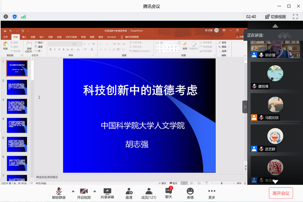 2020年11月13日晚上19:30,中国科学院大学人文学院教授、中国科学院哲学研究所学术委员会副主任委员、《自然辩证法通讯》杂志主编胡志强教授应邀作客我校翱翔名家讲堂,通过腾讯会议平台直播的方式,为我校师生带来了一场主题为《科技创新中的道德考虑》的精彩讲座,我校及来自全国高校近200名师生参加了讲座。本次翱翔名家讲堂由西北工业大学党委学生工作部主办,马克思主义学院承办,马克思主义学院副院长张云龙教授主持。