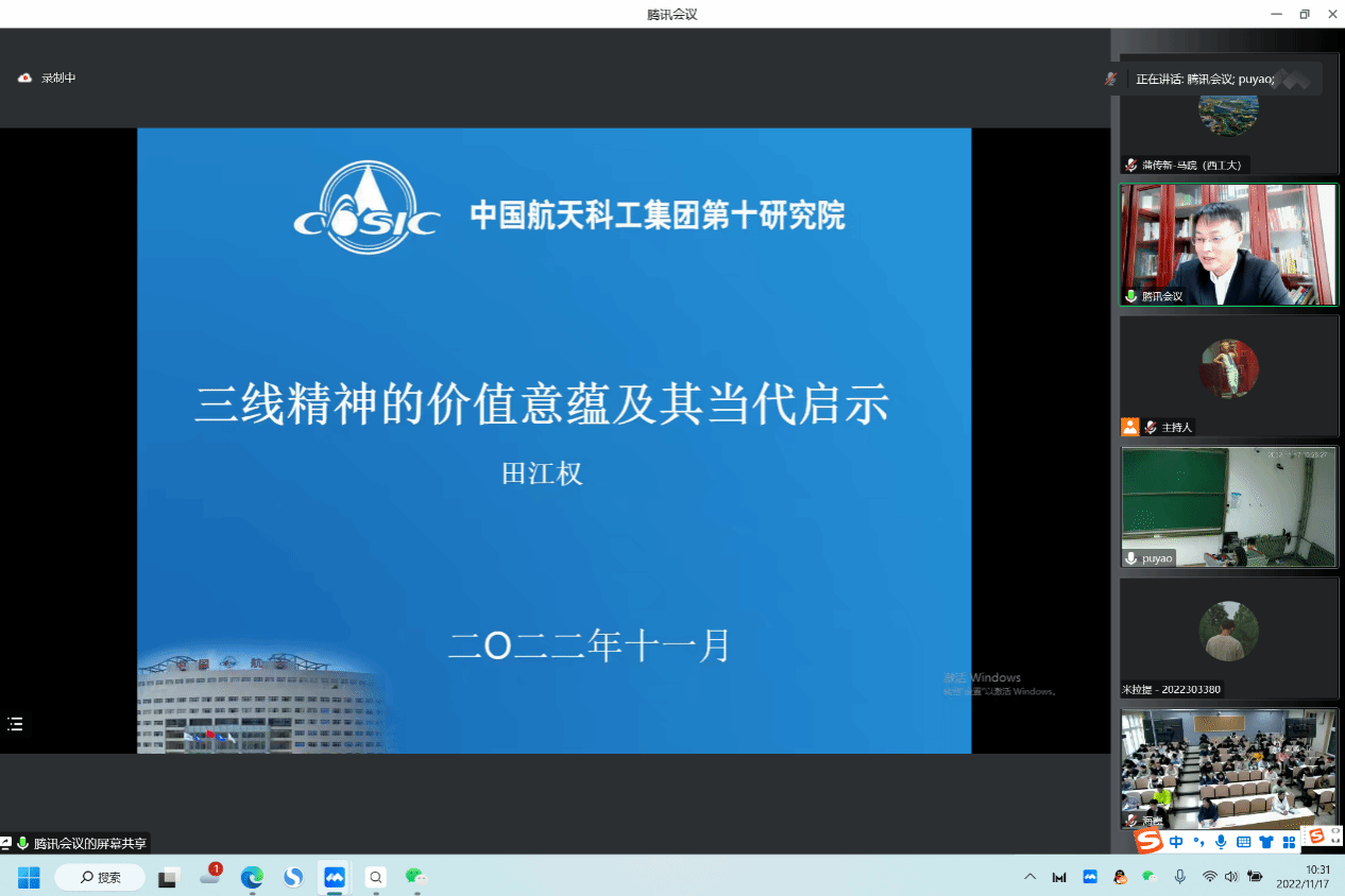 为深入贯彻落实习近平总书记关于“大思政课”的指示批示,深化巩固“四史”教育的课程效果,11月17日,我校邀请到中国航天科工集团第十研究院田江权高级工程师做客翱翔名家讲堂,在云端开展《三线精神的价值意蕴及其当代价值》思政课程交流。本次活动由党委学生工作部主办、马克思主义学院承办。马克思主义学院党委副书记(主持工作)蒲传新、院长助理赵海霞,陕西省思政名师工作室负责人蒲瑶,思政课教师马新蕊、山磊、杜轶伦,以及《中国近现代史纲要》课程的学生共500余人参加了学习。