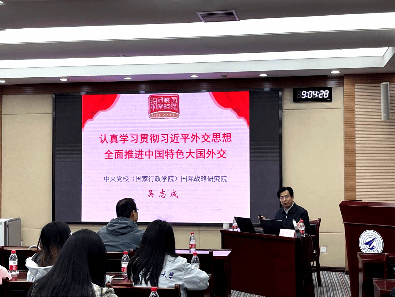 吴志成对学院的热情欢迎和周密安排表示由衷感谢。会上,吴志成作《认真学习贯彻习近平外交思想 全面推进中国特色大国外交》主题演讲,从“是什么、为什么、怎么做”三个方面深入解读了如何准确理解习近平外交思想的科学内涵、如何深刻把握习近平外交思想产生的时代背景、如何全面推进中国特色大国外交的战略实践。