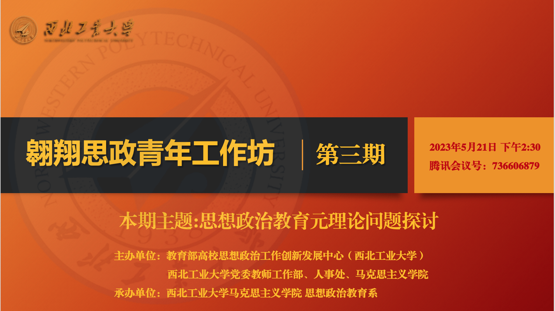 思想政治教育是中国共产党的独特优势和高校各项事业建设发展的中心环节,为夯实与深化思想政治教育学科基础理论的研究,5月21日,西北工业大学马克思主义学院翱翔思政青年工作坊(第三期)在线上成功举行。本工作坊由教育部高校思想政治工作创新发展中心(西北工业大学)、西北工业大学党委教师工作部、人事处、马克思主义学院主办,马克思主义学院思想政治教育系承办。本期工作坊共邀请了五位优秀的青年思政学者,以“思想政治教育元理论问题探讨”为主题,进行观点分享与互评对谈。