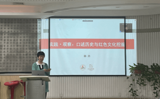 林卉副教授以《实践·观察:口述历史与红色文化挖掘》为主题,首先介绍了“崔永元口述历史研究中心”近年来在口述史实践方面的重大项目,接着总结了自己基于这些项目的行业观察,介绍了她在中国电力、航天、博物馆等领域大型口述历史项目的具体实践经验,最后对我校师生开展的“红色文化口述史”的实践提出了具体的富有建设性与可操作性的建议。