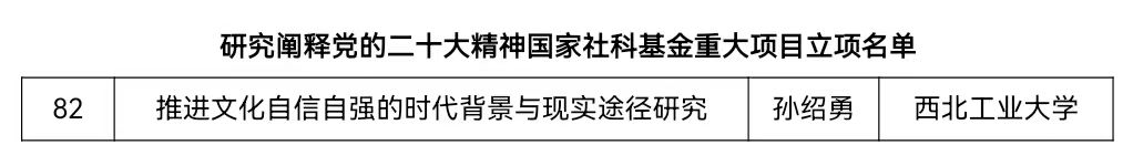 日前,全国哲学社会科学工作办公室公布了研究阐释党的二十大精神国家社科基金重大项目立项名单。马克思主义学院孙绍勇教授担任首席专家申报的课题《推进文化自信自强的时代背景与现实途径》(第82项)获批立项。