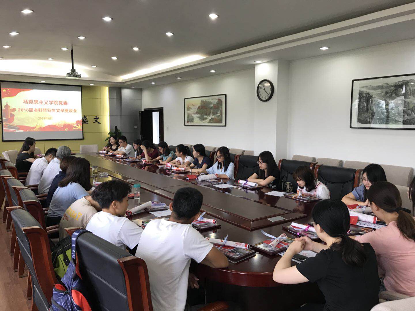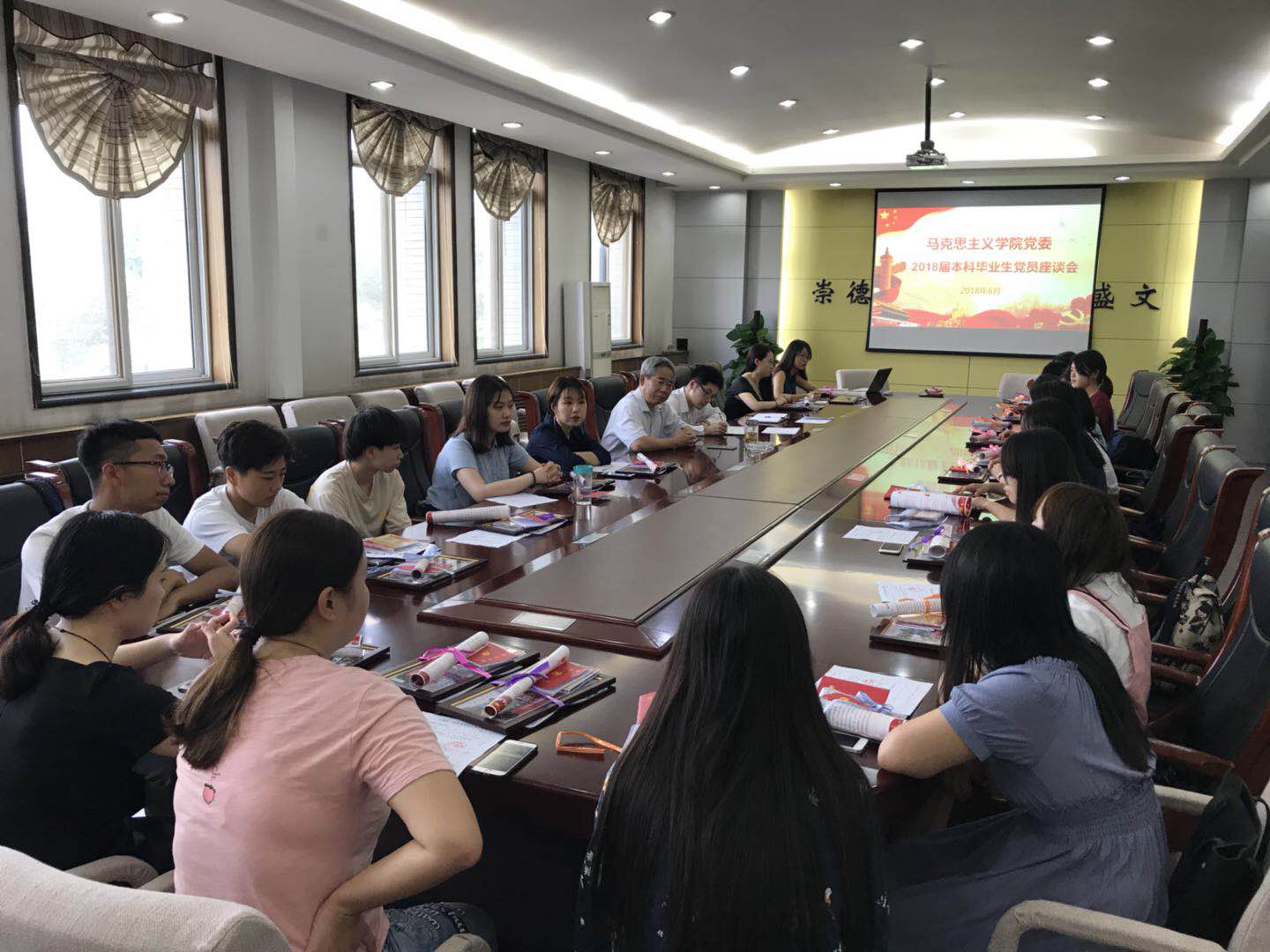 6月25日上午,马克思主义学院党委在学院208会议室召开2018届本科毕业生党员座谈会,学院党委书记鲁卫平,学生党建主管、辅导员曹良玉以及2018届本科毕业生党员参加了座谈会,会议由党委副书记袁源主持。