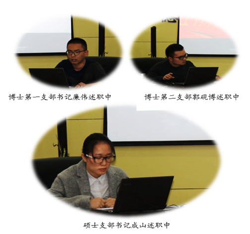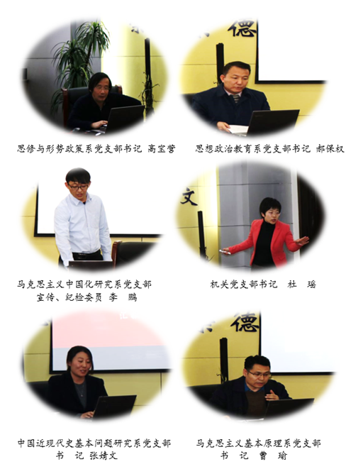 马克思主义中国化研究系党支部支委李鹏(代高旭红书记)、思修与形势政策系党支部书记高宝营、马克思主义基本原理系党支部书记曹瑜、思想政治教育系党支部书记郝保权、机关党支部书记杜瑶、中国近现代史研究系党支部书记张婧文以及硕士生党支部书记成山、博士生第一支部书记廉伟、博士生第二支部书记郭砚博依次进行了述职。他们均从2018年以来支部书记履职尽责情况、支部年度开展的工作、工作中存在的主要问题和下一步工作思路等四个方面进行了现场述职。