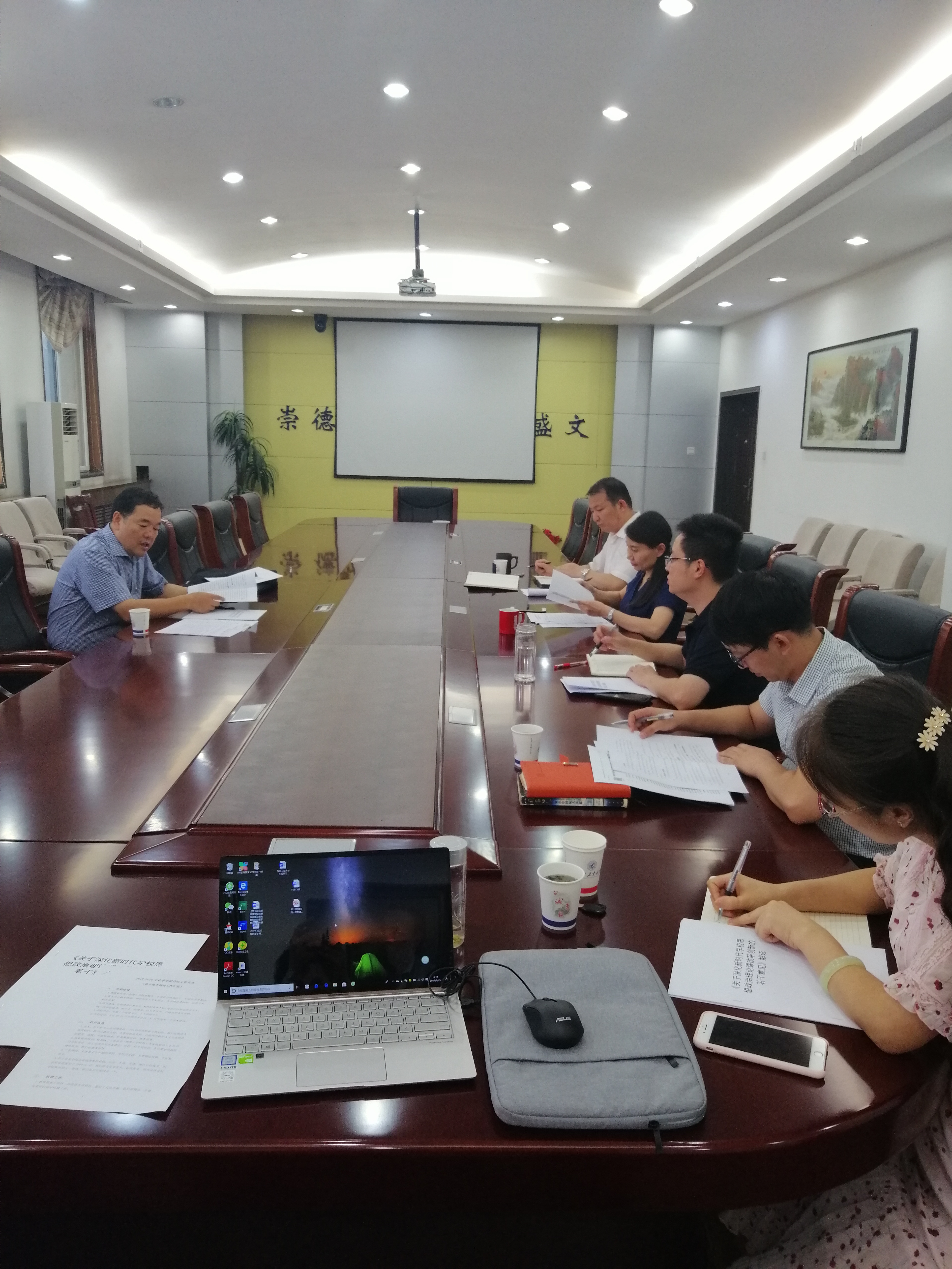 会上,陈建有传达了学校第十三次党代会精神,并就贯彻落实《关于深化新时代学校思想政治理论课改革创新的若干意见》与参会人员开展研讨。围绕思政课改革创新,杨云霞院长从学科建设、思政课教师队伍建设、科研工作、学院建设进行了汇报;吴闻川副书记(主持工作)就探索建立思政课“金课”建设、检验标准,本学期计划推出思政课改革创新试点课程的情况进行了汇报;副院长郝保权、党委副书记李鹏、院长助理全家悦分别就分管工作做了补充汇报。