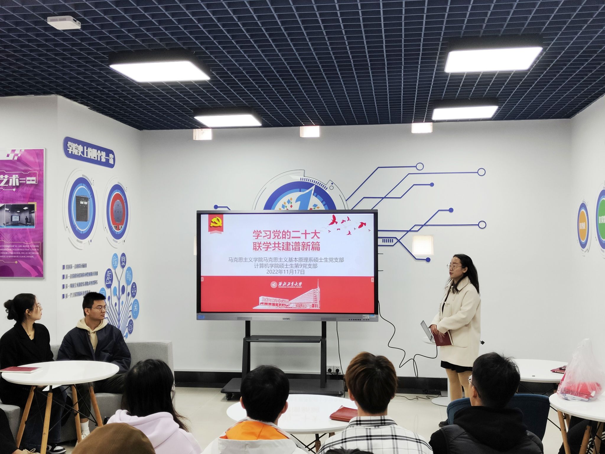 为深入学习贯彻党的二十大精神,在学生党员中掀起学习热潮,进一步推动党的二十大精神入脑入心、落实落地,西北工业大学马克思主义学院马克思主义基本原理系硕士生党支部和计算机学院研究生第九党支部联学共建,11月17日10点在计算机学院党员活动室开展“学习党的二十大,联学共建谱新篇”主题党日活动,本次会议由马克思主义基本原理系硕士生党支部书记王慧新主持。