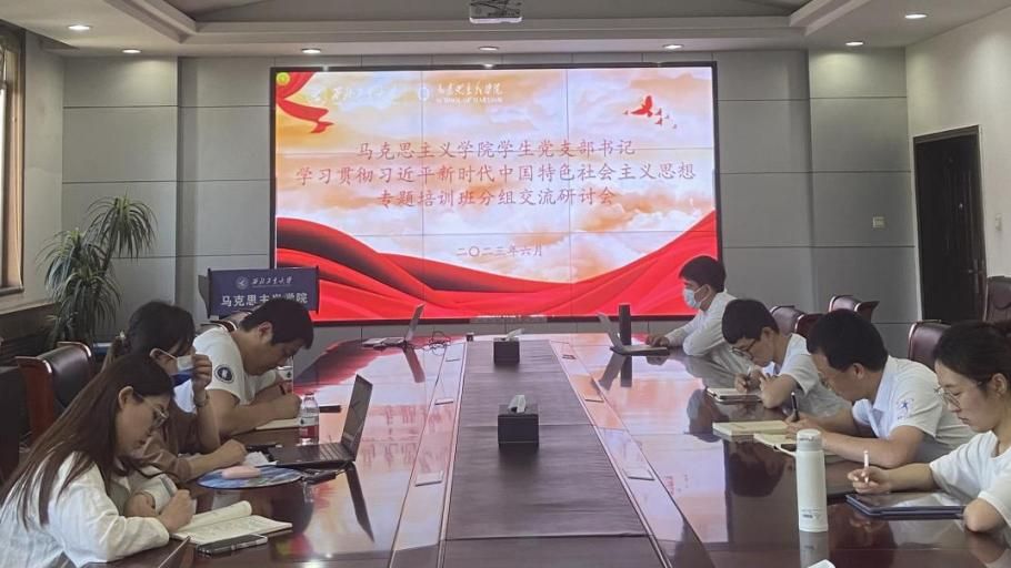 为深入学习贯彻习近平新时代中国特色社会主义思想,推进学生党支部建设夯基提质。6月9日下午,西北工业大学马克思主义学院学生党支部书记学习贯彻习近平新时代中国特色社会主义思想专题培训班分组交流研讨会在学院208会议室举行。马克思主义学院党委副书记李刚、专职辅导员王换、兼职辅导员赵桐瑶、各学生党支部书记参与研讨交流。
