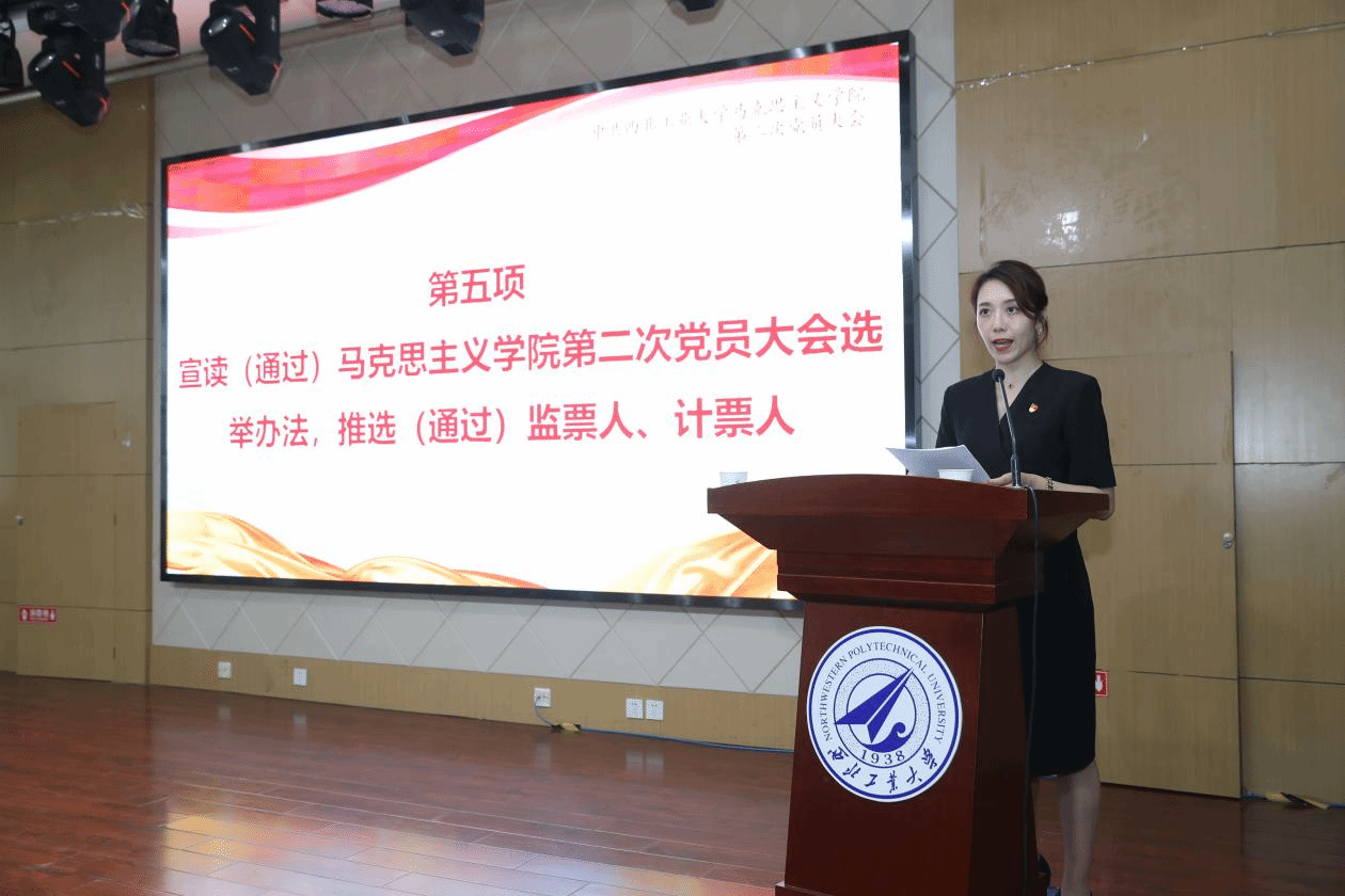 郭雅楠同志宣读《中共西北工业大学马克思主义学院第二次党员大会选举办法》(以下简称《办法》)。《办法》经大会审议通过。根据该办法推选总监票人1名,监票人2名;总计票人2名,计票人9名。大会通过了监票人、计票人名单。