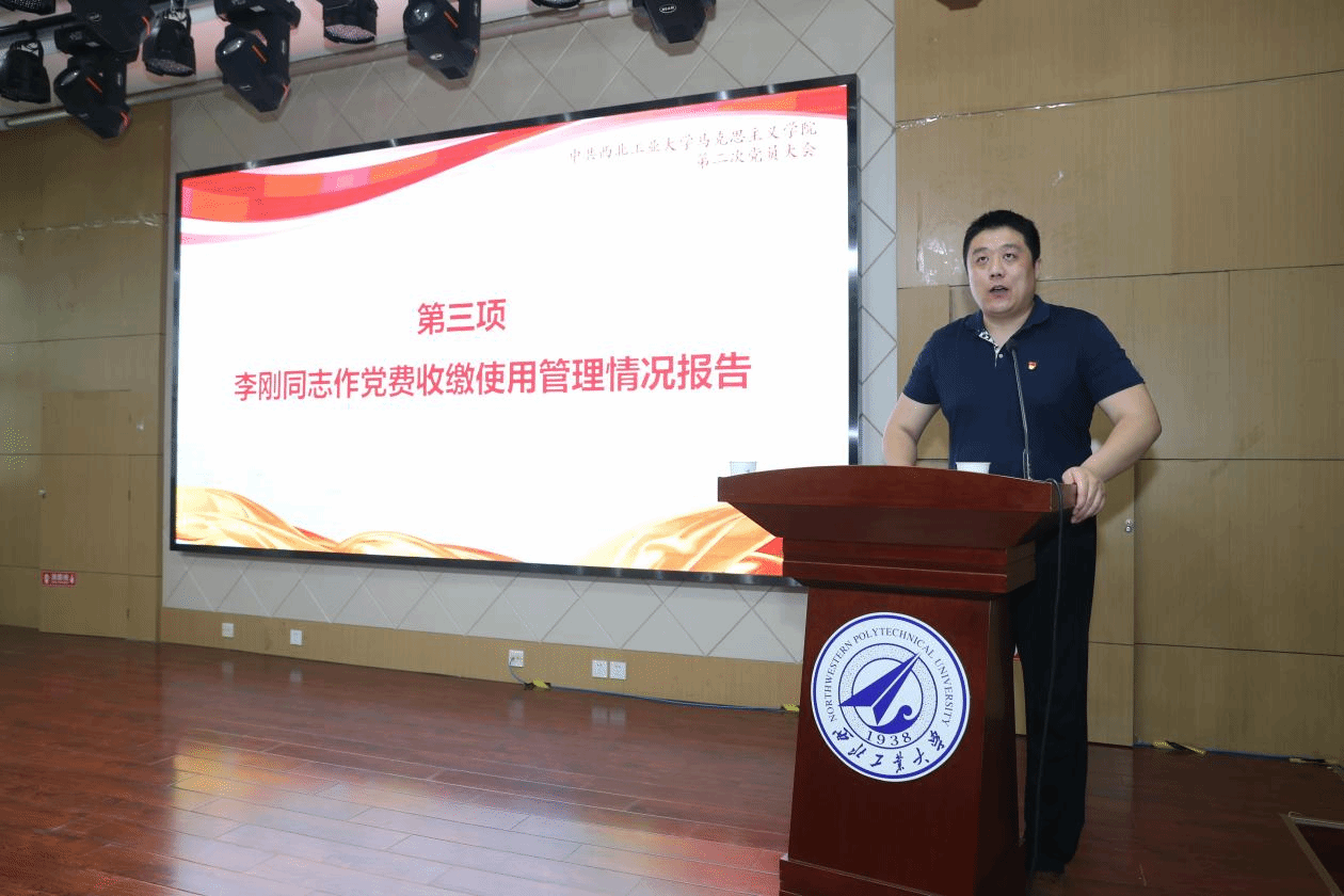 李刚同志代表学院党委作《关于中共西北工业大学马克思主义学院委员会党费收缴、使用和管理情况的报告》的工作报告。报告经大会审议通过。