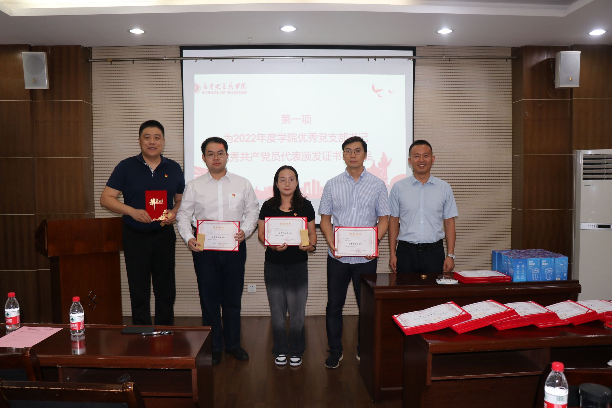 2023年9月14日上午,马克思主义学院在学院305会议室举行2023年党建工作研讨暨优秀党支部书记、优秀共产党员表彰会。马克思主义学院党委书记蒲传新,党委副书记、院机关党支部书记李刚,系支部书记曹瑜、陈诚平、鲁杰、马新蕊、宫淑燕,学生各党支部书记及优秀共产党员代表等参加了表彰会。会议由蒲传新主持。
