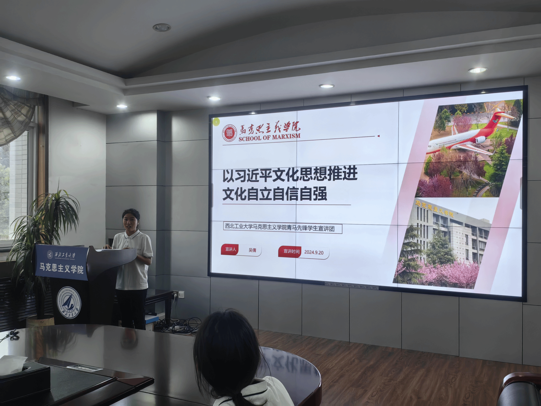 接着,西北工业大学马克思主义学院青马先锋学生宣讲团两位成员分别进行主题宣讲。吴倩同学以《以习近平文化思想推进文化自立自信自强》为题,围绕巩固文化主体性、讲好中国故事、推进“两个结合”、高质量推进特色育人文化建设四个方面进行阐述。谢琳同学以《自觉做勇于担当作为的不懈奋斗者》为题,结合何功伟、廖俊波、陈士橹的先进感人事迹,阐释了自己对新时代青年责任担当的思考和理解。