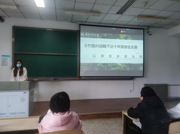 在这次思政课上,2021级硕士生李红梅同学最先和伙伴们分享了袁家村的致富故事,从袁家村厚重的产业发展历史到特色的产业发展模式,最后总结了袁家村发展面临的困境和提升袁家村民俗文化旅游的建议,特别指出乡村旅游中民俗文化是关键、一二产业是支撑、发展理念是动力。方译莹同学就第二调研地周至水街与大家分享了实践感悟。她介绍了周至水街的总体情况和发展现状,实践队在实践过程中发生的小故事,以及目前水街发展过程中所遇到的现实问题,并提出相应的对策建议。宋佳纹同学对第三个调研地西安市鄠邑区东韩村的实践情况进行了介绍,分析了东韩村在改革开放以及乡村振兴政策支持下所取得的重大成就以及发展过程中面临的问题,提出针对性的建议,最后分享了实践的切身感受。