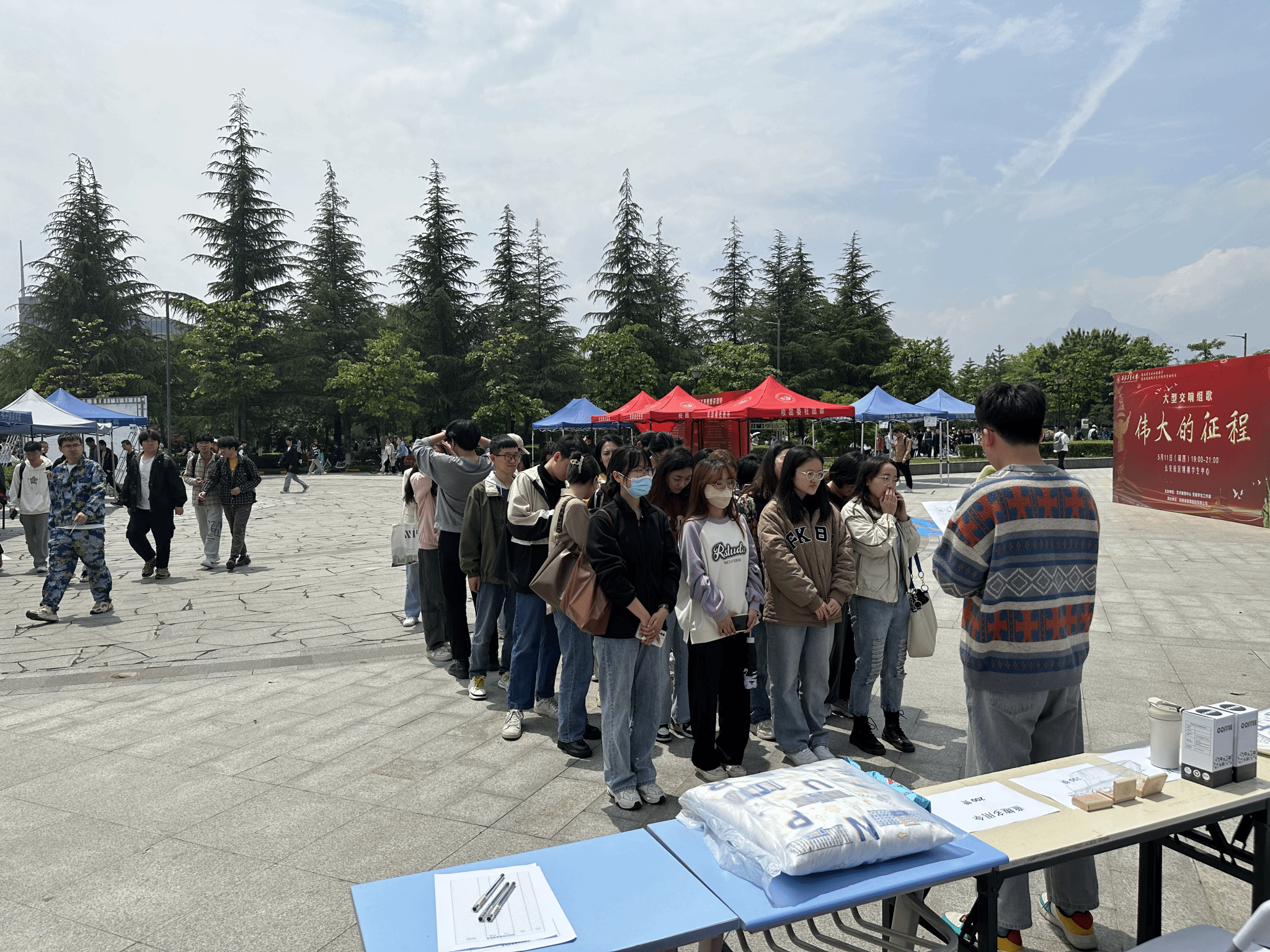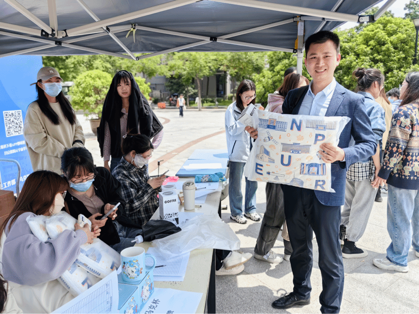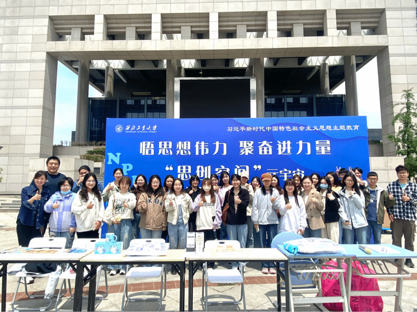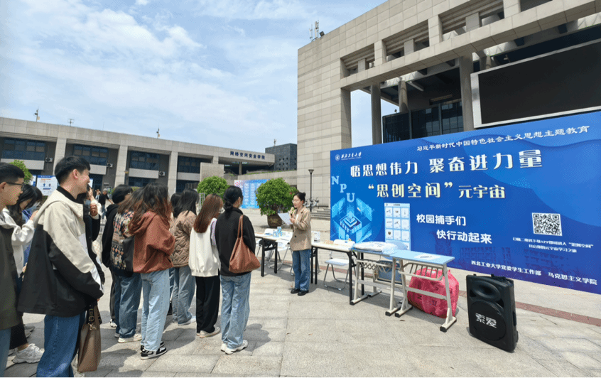 2023年5月8日中午,西北工业大学党委学生工作部、学生处,马克思主义学院在长安校区翱翔学生中心广场前,举办了“思创空间”启动仪式,深邃海军蓝展板上“悟思想伟力,聚奋进力量”十个大字让同学们纷纷驻足参与。