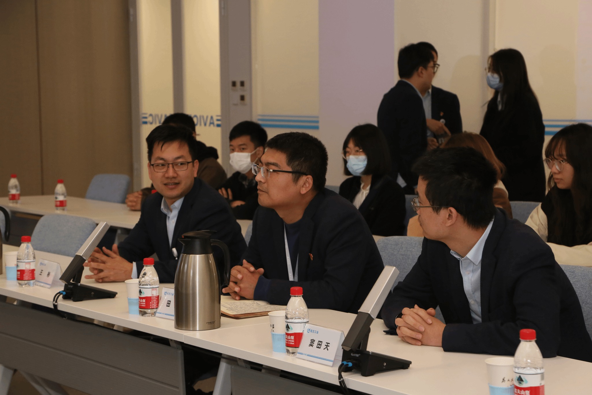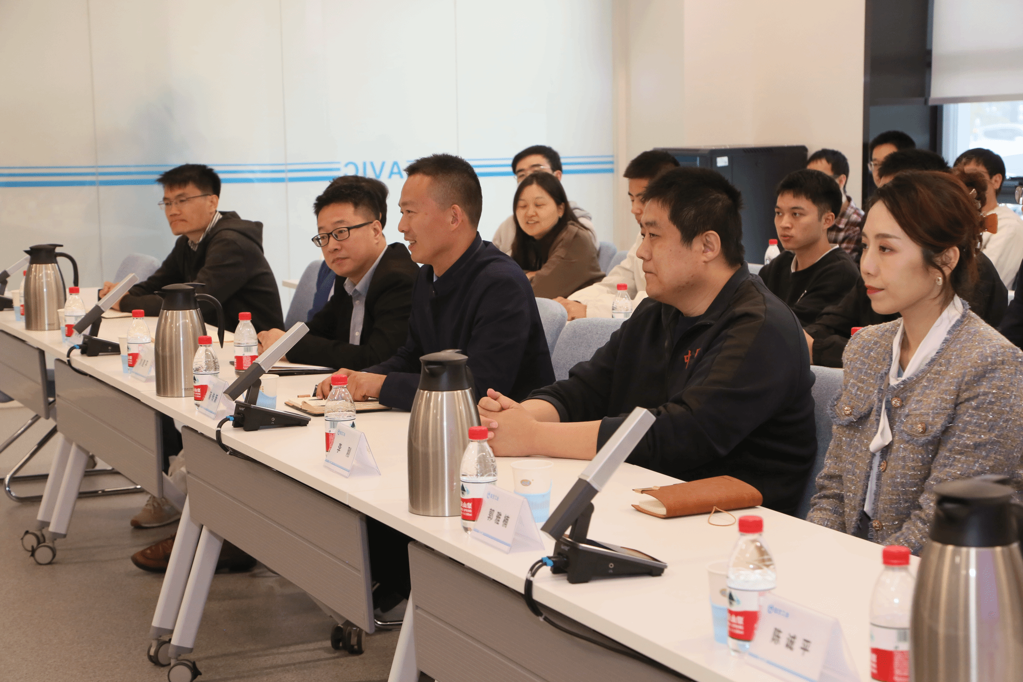 参观结束,一行人来到会议室开展党课学习和座谈研讨。双方互相介绍了参会人员。中航一飞院党建文宣部副部长王彬介绍了一飞院党建工作相关情况,并就主题教育开展情况作了简要交流。蒲传新介绍了我校历史沿革、航空血脉以及学院思政课开展情况。双方参会人员就校企航空文化建设和航空精神传承等开展自由交流。
