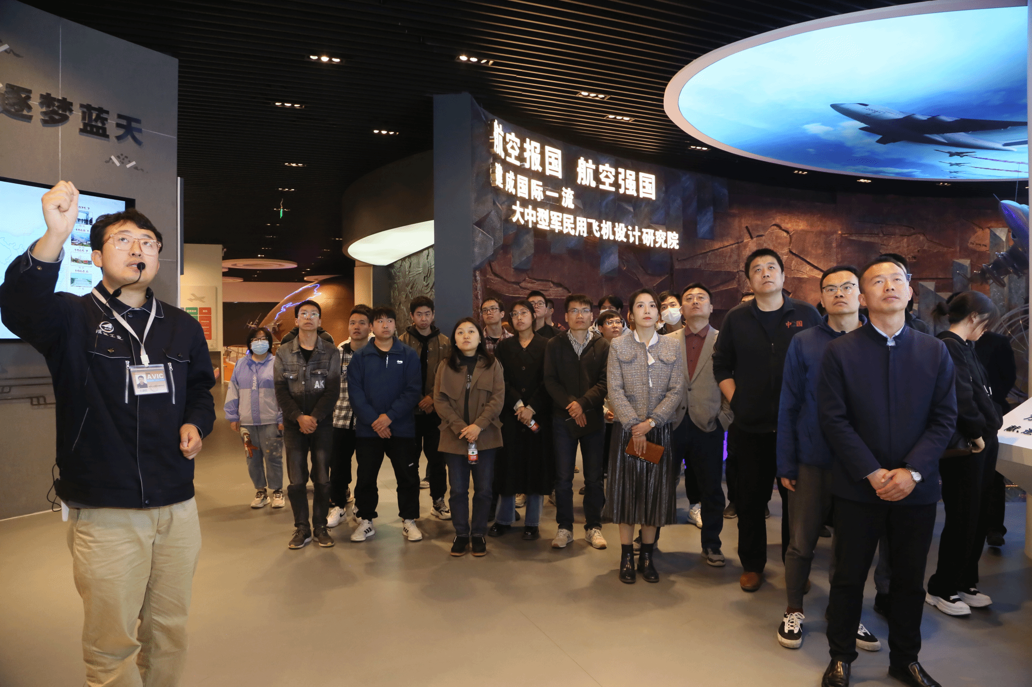 驱车抵达目的地,中航一飞院党建文宣部副部长王彬热情接待了我校师生,在相关工作人员带领下,马克思主义学院和航空学院师生一行首先走进虚拟仿真实验室,观看宣传片《光荣·梦想》,体验3D虚拟仿真技术;接着参观展览馆,切实了解一飞院发展历程、强军装备、民用产品、研发技术、协同产业等方面的基本情况。丰富的史料、多样的模型、详细的讲解,给我校师生上了一堂生动的实践课,让大家深入了解了一飞院人忠诚奉献、逐梦蓝天的创业史、创新史和发展史。