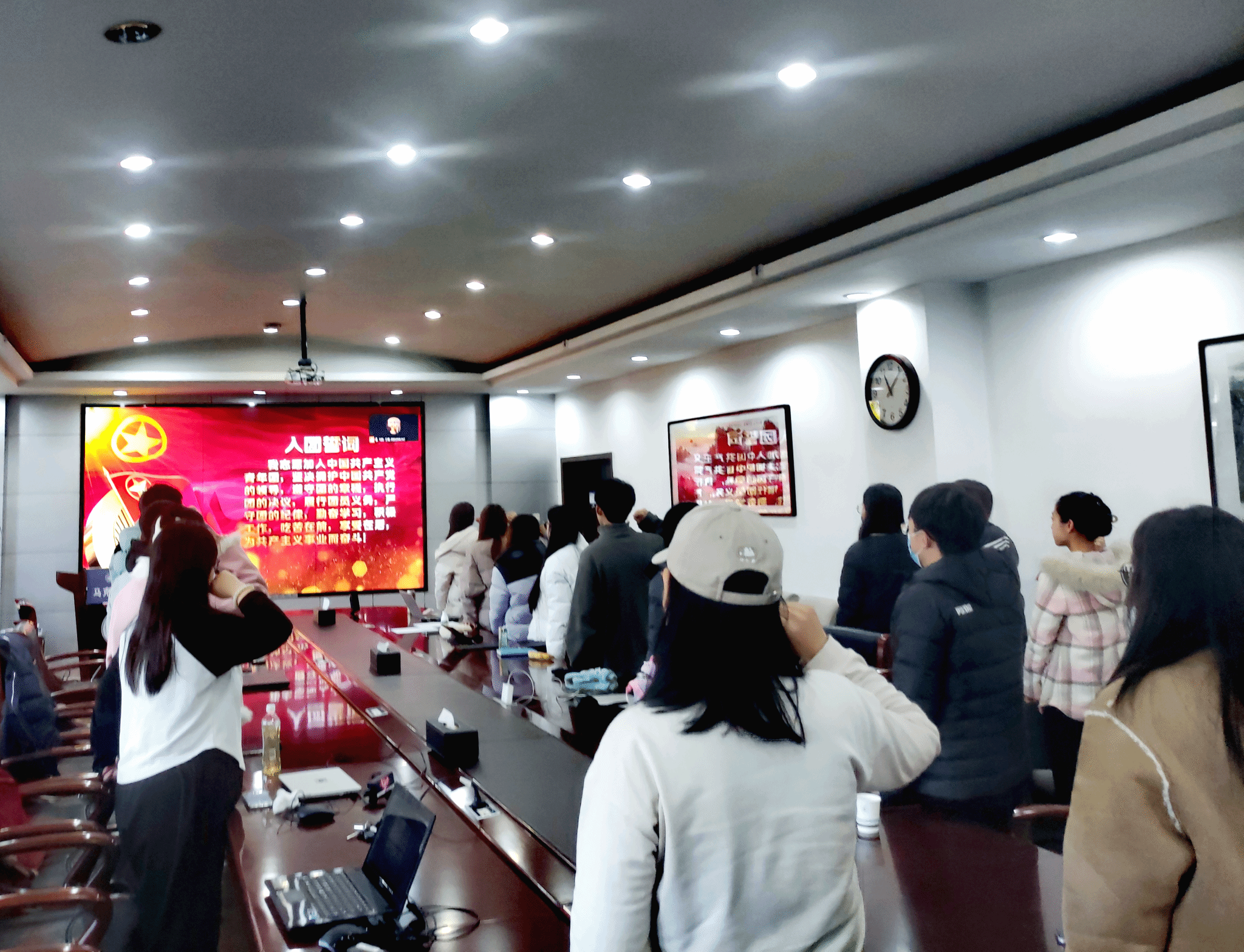 组织生活会最后一项,各团支部全体参会团员面对团旗,高举右拳,重温入团誓词。铿锵有力的誓词激励着团员青年们进一步坚定理想信念,树立历史使命感和社会责任感,不断砥砺奋进,做共产主义远大理想和中国特色社会主义共同理想的坚定信仰者和忠诚实践者,以不畏艰难、勇于担当的姿态迎接新时代的挑战。
