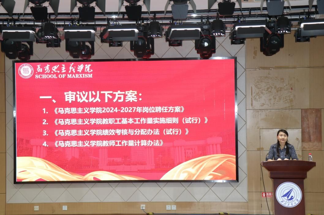 首先,院长杨云霞介绍2024-2027年学院岗位聘任方案。随后组织全体参会教职工,共同审议通过《马克思主义学院2024-2027年岗位聘任方案》《马克思主义学院教职工基本工作量实施细则(试行)》《马克思主义学院绩效考核与分配办法(试行)》《马克思主义学院教师工作量计算办法》。