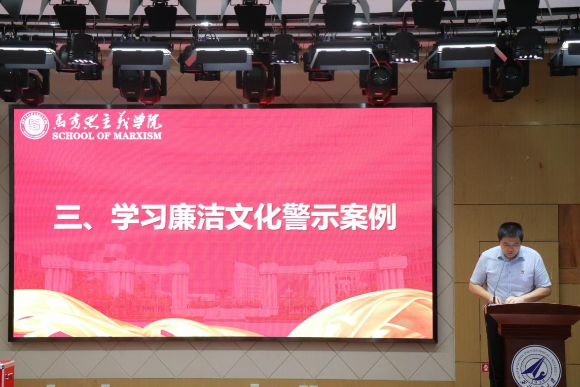 紧接着,学院党委副书记李刚组织全体参会教职工,学习廉洁文化警示案例,并提醒各位导师知悉学生假期行程安排,了解学生动向和近况,做好假期安全教育。