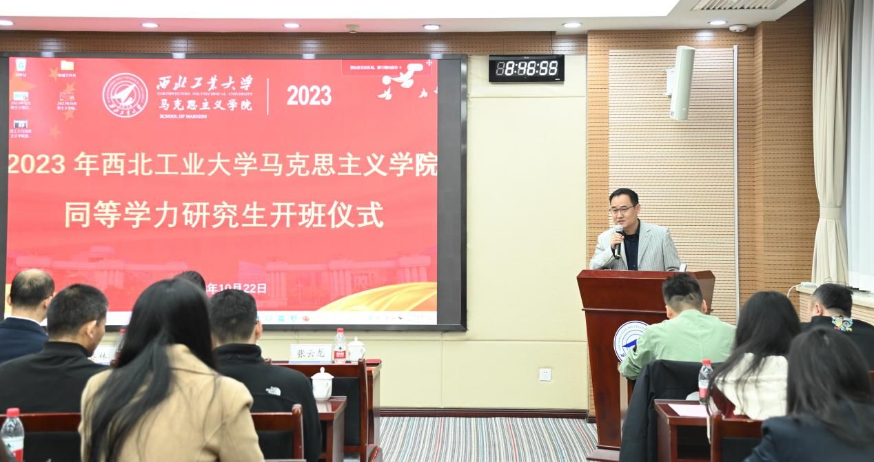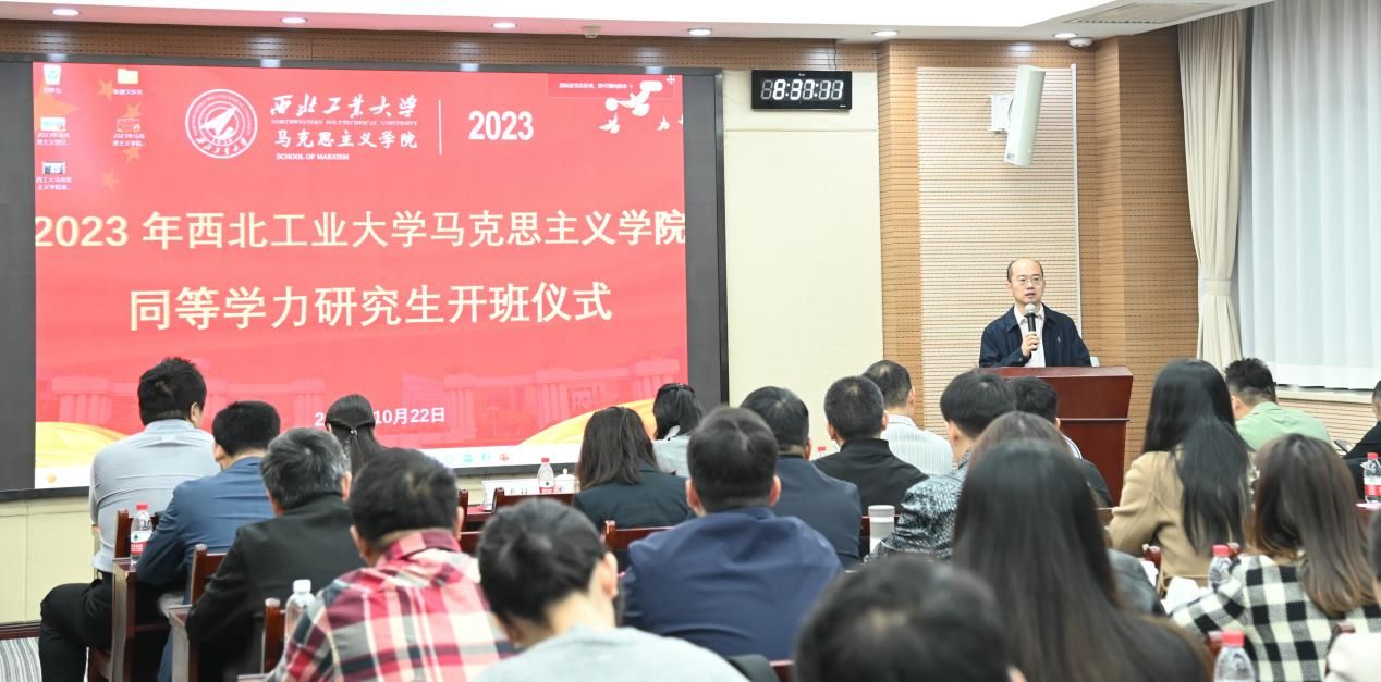 2023年10月22日上午,西北工业大学马克思主义学院2023级同等学力研究生开班仪式在国际会议中心举行。研究生院常务副院长李春林、马克思主义学院院长杨云霞、学院党委副书记李刚、研究生导师代表及2023级同等学力全体研究生参加开班仪式。学院副院长张云龙教授主持会议。