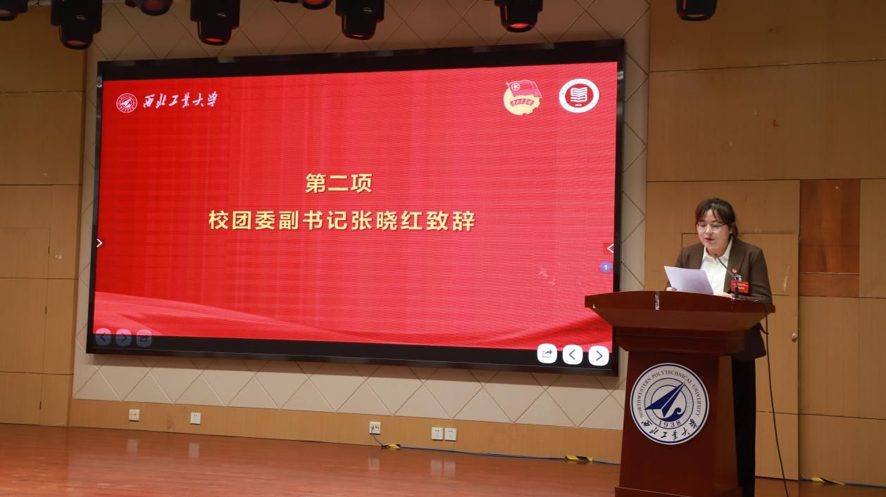 首先,西北工业大学团委副书记张晓红致辞。她代表校团委向大会的召开表示热烈的祝贺并肯定了马克思主义学院团委的工作,指出青马学子在积极投身乡村振兴、“大思政课”建设、理论宣讲等方面取得了显著成绩,用实践证明了青马学子的使命担当。同时,她代表校团委向学院团员青年提出了三点建议:一是要坚定理想信念,认真学习贯彻习近平新时代中国特色社会主义思想,增强“四个意识”、坚定“四个自信”、做到“两个维护”;二是要勇担时代重任,主动强化实践锻炼、贴近人民群众、深入基层一线,让青春绽放在祖国最需要的地方;三是要保持奋斗激情,在新征程上吃苦耐劳、自力更生,弘扬永久奋斗的优良传统。