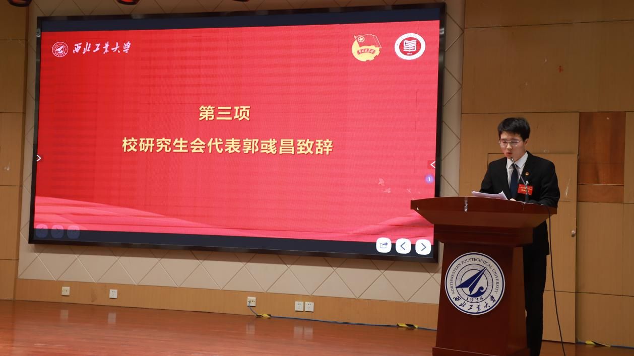 接着,西北工业大学研究生会代表郭彧昌致辞。他代表校研究生会向学院全体研究生致以诚挚的问候,肯定了马克思主义学院研究生会过去一年在思想引领、“双一流”建设、基层服务、志愿活动等多个方面的努力和成果,并提出希望能够进一步加强校院的交流合作。同时,他向学院研会和学生代表提出了三点希望:一是要聚焦政治引领,把学习贯彻党的二十大和二十届二中、三中全会精神贯穿履职尽责始终;二是要聚焦“形神兼备”,把学联学生会组织改革进行到底;三是要聚焦主责主业,把服务同学和服务大局落到实处。
