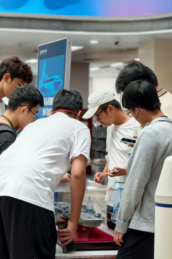 在三航特藏馆内,一排排精致的“三航”模型静静陈列,仿佛在诉说着中华民族向海图强、逐梦空天的壮阔征程。各类飞机模型不出意外的成为同学们关注的焦点,我国自主研制的第五代战斗机歼-20模型,吸引了大量新生驻足观看。大家三三两两地凑在模型前,聚精会神地观察每一个细节。