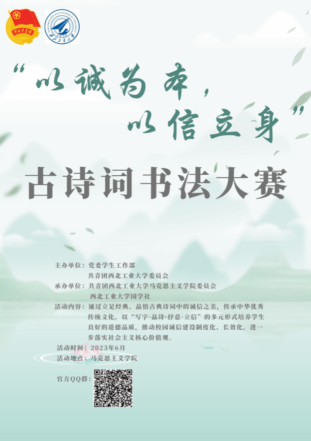 为深入贯彻落实习近平新时代中国特色社会主义思想和党的二十大精神,加强学生诚信教育,推动廉洁文化与中华优秀传统文化有机融合,引导广大青年学生在传承中国古典诗词中涵养身心,敦品励行,6月16日,由西北工业大学党委学生工作部、共青团西北工业大学委员会主办,共青团西北工业大学马克思主义学院工作委员会承办的“以诚为本,以信立身”古诗词书法大赛成功举办,共收集作品60多幅,包括硬笔、软笔两种类型。大赛以“写字·品诗·抒意·立信”多元形式开展,由马克思主义学院博士生专职辅导员、书法研究爱好者高红波担任评审老师。