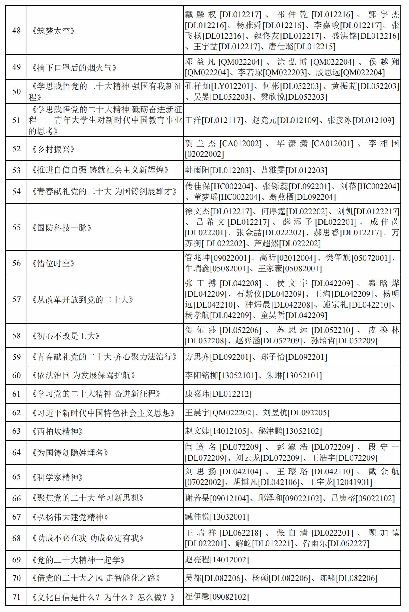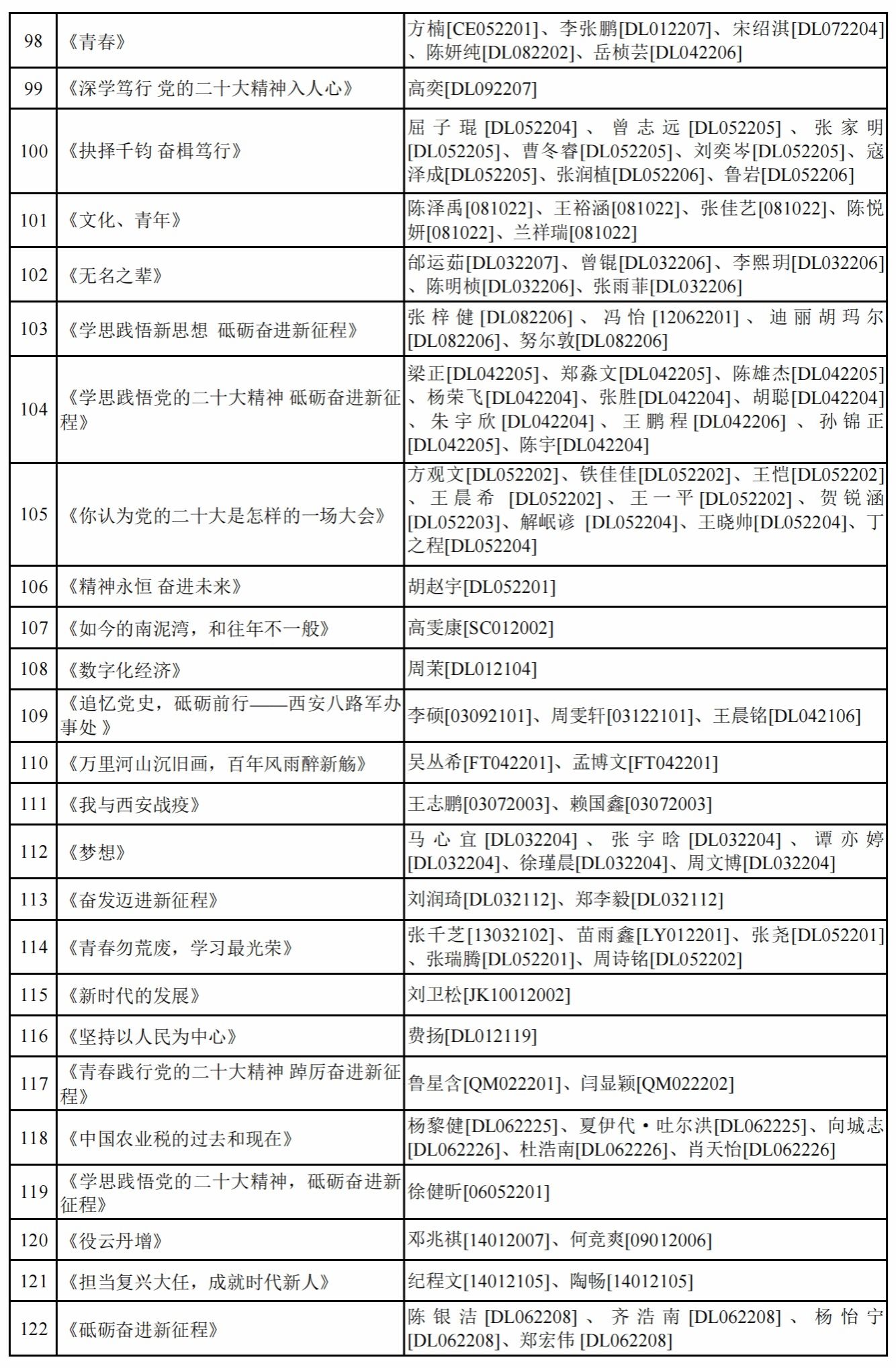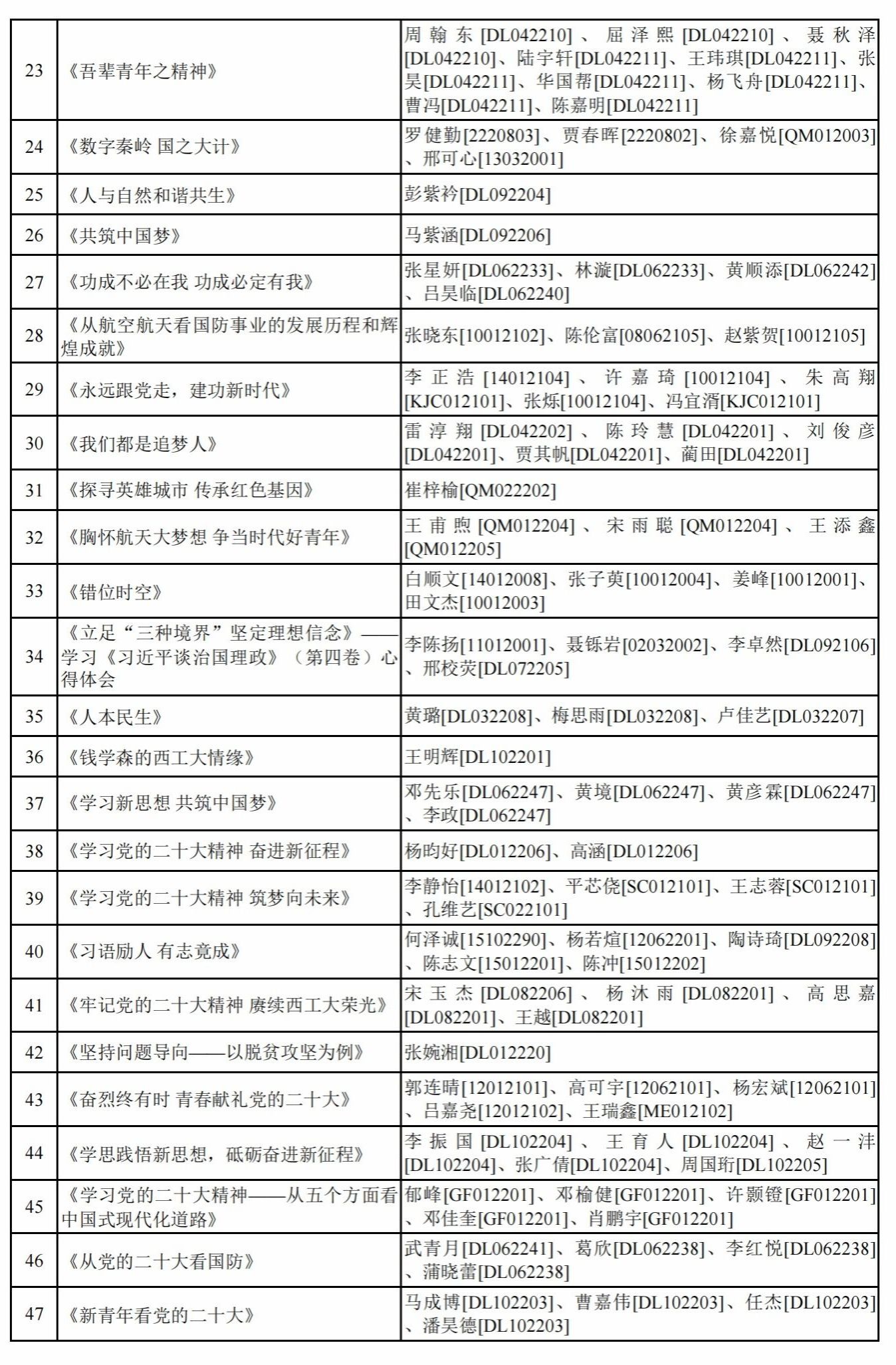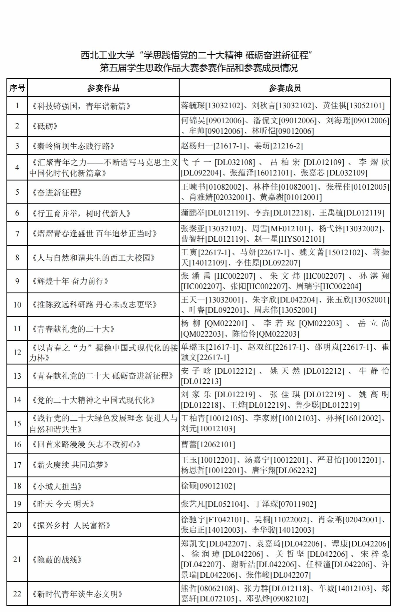为引导全校学生充分认识党的二十大召开的重大意义,深入学习宣传贯彻党的二十大精神,深刻领会把握新时代新征程的使命任务,切实把思想和行动统一到党的二十大精神上来,把智慧和力量凝聚到实现党的二十大确定的各项任务上来,西北工业大学党委学生工作部、马克思主义学院面向全校学生开展“学思践悟党的二十大精神 砥砺奋进新征程”第五届学生思政作品大赛。现将参赛作品和参赛成员予以公示。公示期间如有问题请向马克思主义学院相关负责人反映。