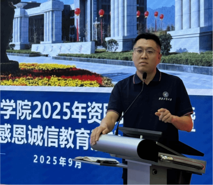 活动现场,学工主管刘敏首先介绍学院本年度资助工作整体安排,强调资助不仅是经济帮扶,更是立德树人的重要载体,鼓励同学们主动了解政策、诚信申报、合理运用资源;随后,兼职辅导员邵明岚围绕校院两级资助政策,从资助对象、申请流程、常见问题等方面系统解读,确保政策宣传精准覆盖每一位新生;叶恒语同学以朋辈视角分享自身经历,讲述资助政策对学业成长的切实支持,用真实故事传递感恩之心与诚信之力。最后,院党委副书记耿云辉总结发言,寄语2025级新生将政策关怀转化为奋进动力,以优异成绩和良好品行回馈社会。