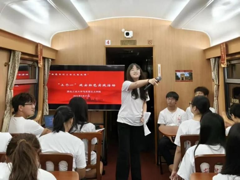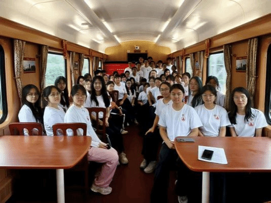 车厢内,红色氛围格外浓厚:主题宣讲环节,两位同学围绕我党在延安和大别山两个革命老区的革命故事、结合新时代青年使命,让信仰之力走进学子心间;红歌传唱环节,《没有共产党就没有新中国》的经典旋律响起,师生们齐声高歌,铿锵歌声里满是对革命先辈的缅怀与对祖国的热爱;知识竞答环节,题目聚焦党史知识、延安精神核心要义,学子们踊跃举手、争相作答,在互动比拼中加深对革命历史的认知与理解。