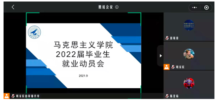 为进一步增强毕业生就业意识,解决学生就业困惑,提高就业质量,2021年9月28日,马克思主义学院2022届毕业生就业动员会以线上+线下相结合的方式顺利召开。学院党委副书记李刚、辅导员马超、研究生会成员及2022届全体毕业生参加了本次就业动员会。会议由兼职辅导员周家欣主持。