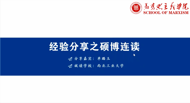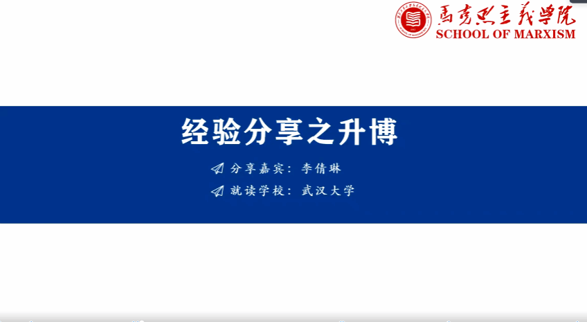 第三位学姐单璐玉从《关于做好2024年硕博连读研究生选拔工作的通知》与马克思主义学院硕博连读复试工作方案两份重要文件出发,详细解读了硕博连读的选拔条件、选拔流程与书面材料等申请程序,并分析了后期考核流程与内容,使同学们全面了解学校的硕博连读方案。