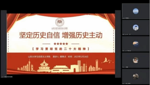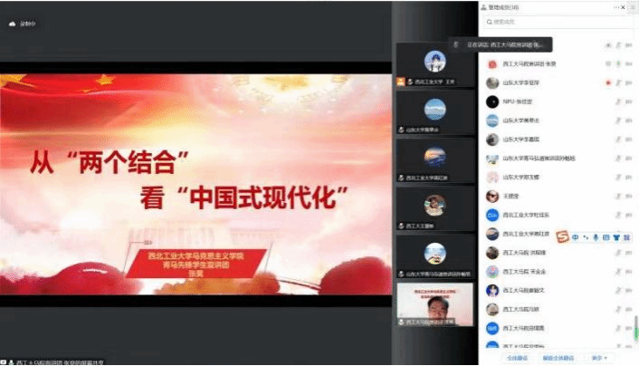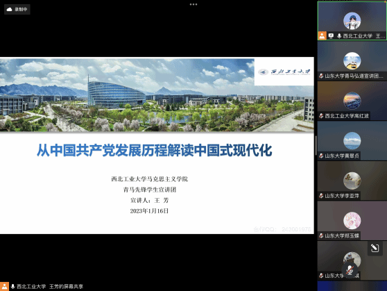 为进一步引导广大青年学生深入学习宣传贯彻党的二十大精神,深入推进党的二十大精神入脑入心、走实走深、见行见效,持续在高校青年中掀起学习热潮,2023年1月16日晚七点,西北工业大学马克思主义学院青马先锋学生宣讲团与山东大学马克思主义学院“青马弘道”理论宣讲团联合举办“联学共建齐宣讲,同心同行谱新篇”主题宣讲活动。