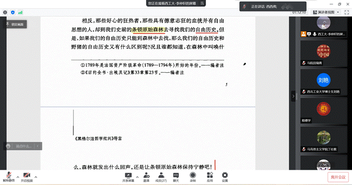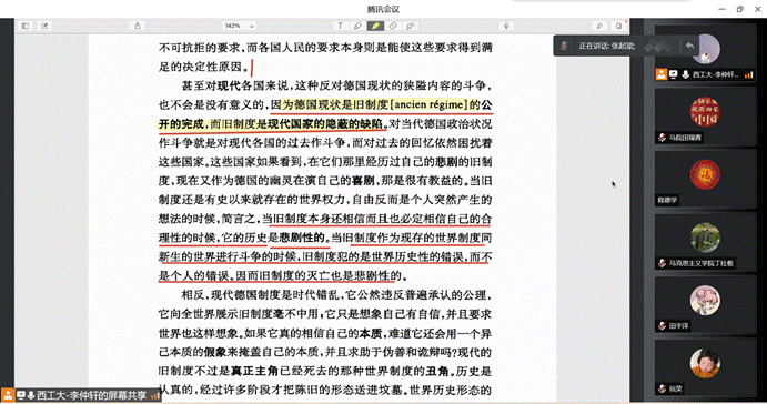 2020年3月21日晚上7点,西北工业大学第29期“启真明智”读书会通过腾讯会议顺利举行,本次读书会由马克思主义学院助理教授张起梁主持,西北工业大学马克思主义学院教授丁社教、张云龙、助理教授杨永强做客云端,与硕博同学一起阅读马克思和恩格斯的经典著作,本次读书会的阅读内容为《黑格尔法哲学批判》导言。