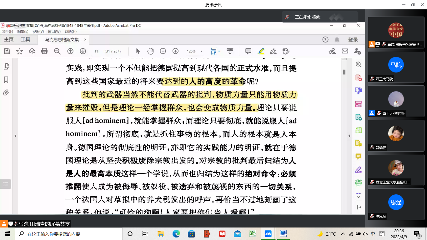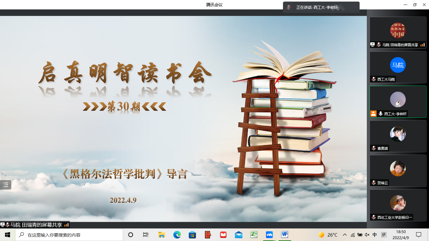 2022年4月9日晚七点,“启真明智”读书会第30期在腾讯会议顺利举行,本次读书会邀请西北工业大学马克思主义学院教授丁社教、张云龙、准聘副教授杨荣与青年学子们一同阅读马克思的经典著作《黑格尔法哲学批判》导言,解读马克思关于人类解放的思想。读书会由马院助理教授张起梁主持,学院党委副书记李刚全程参与读书会。