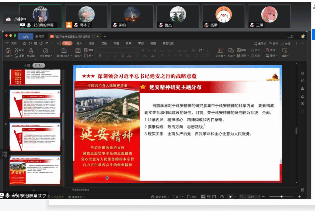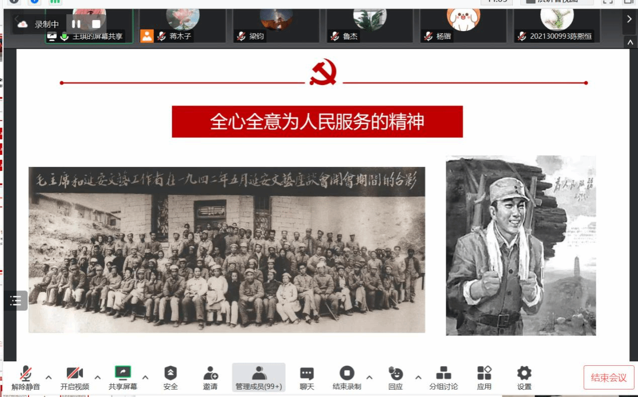 读书会的第一位导读人是我院硕士生王琪同学。她从党的七大与延安十三年的历史意义、延安精神的丰富内涵、延安精神在新时代的继承和发扬三个方面对延安精神进行了诠释。首先是党的七大与延安十三年的历史意义,从政治、思想、组织上对历史地位和作用进行了讲解。在延安精神的丰富内涵专题中,王琪同学多维度的从坚定正确的政治方向;实事求是的思想路线;全心全意为人民服务的精神;自力更生、艰苦奋斗的创业精神四个方面入手,对延安精神进行了阐述。第三个专题是延安精神在新时代的继承和发扬。首先强调要坚定正确的政治方向,然后是坚持实事求是的思想路线,其次是要在实践创新的过程中不断进行理论创新,再次是恪守全心全意为人民的根本宗旨,最后是要继续秉承“自力更生、艰苦奋斗”的创业精神。