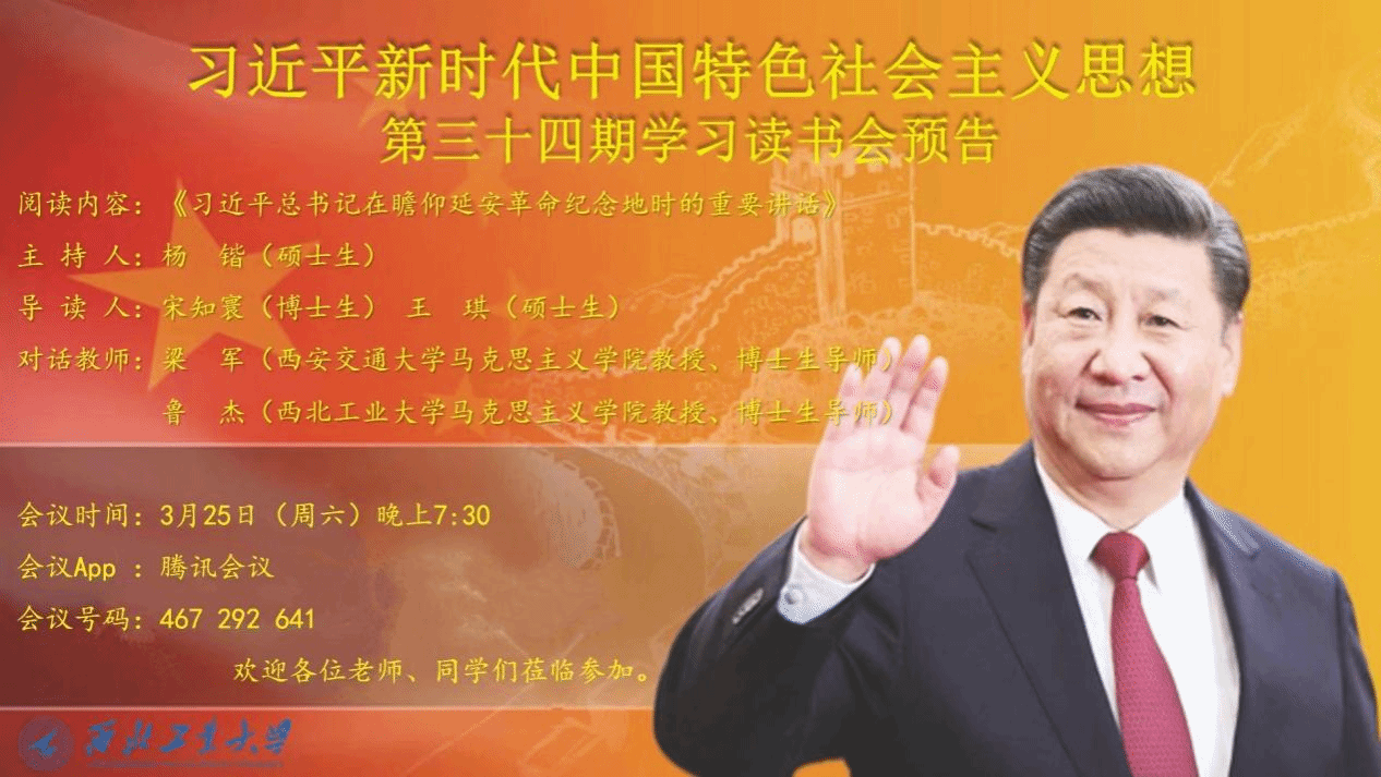 为全面学习贯彻党的二十大精神,推进习近平新时代中国特色社会主义思想进教材、进课堂、进头脑。2023年3月25日,西北工业大学马克思主义学院习近平新时代中国特色社会主义思想学习读书会第三十四期活动主题围绕《习近平总书记在瞻仰延安革命纪念地时的重要讲话》进行学习研讨。本次读书会由我院思想政治教育系主任、博士生导师鲁杰教授发起,学院硕士生杨锴主持,西安交通大学马克思主义学院教授、博士生导师梁军作为对话教师应邀参加。