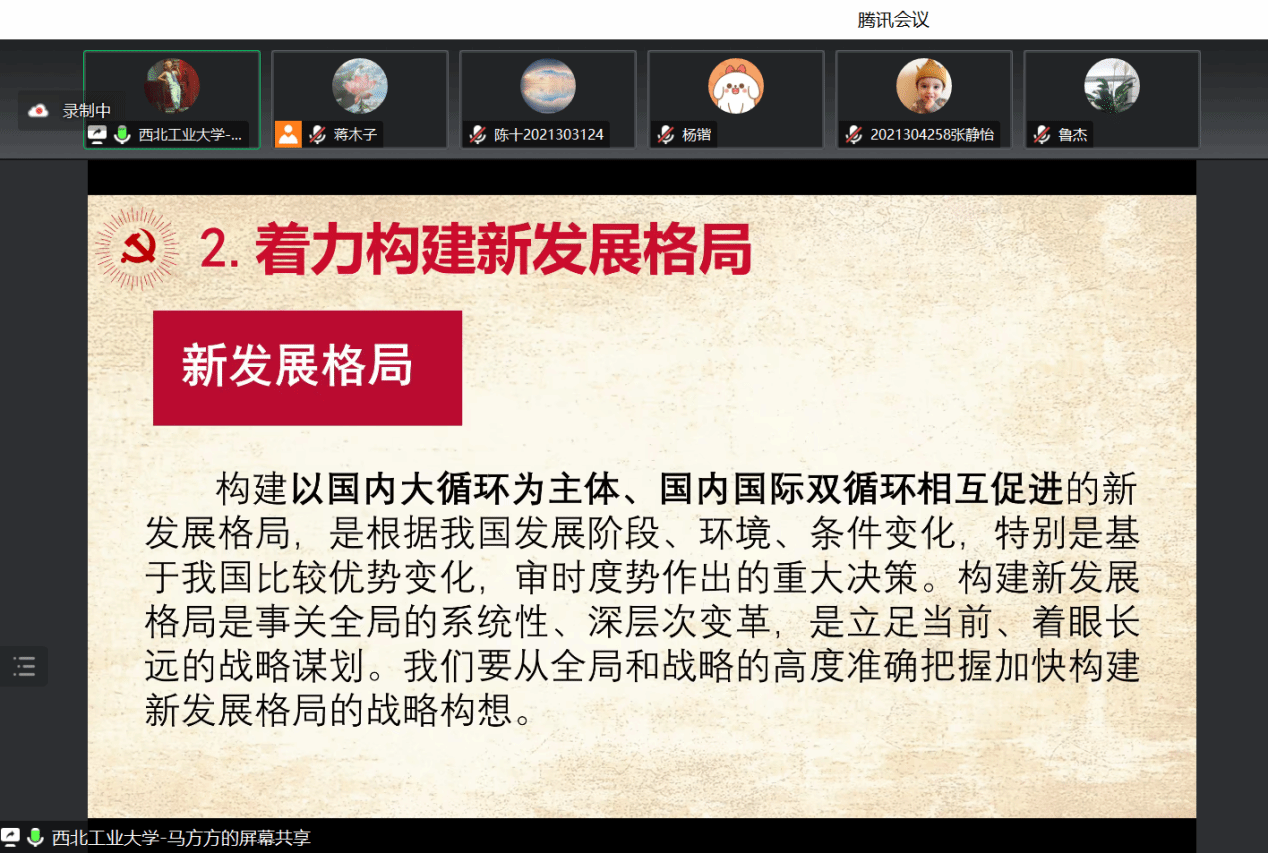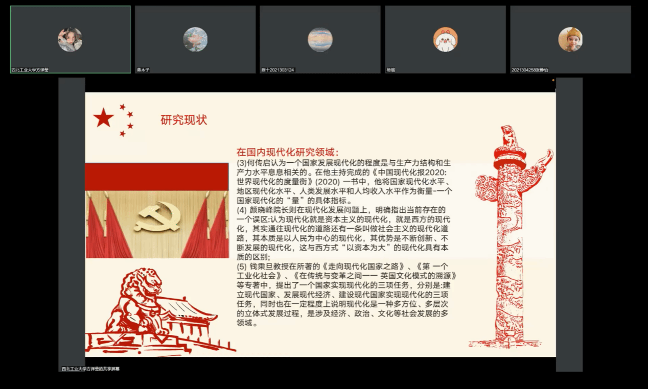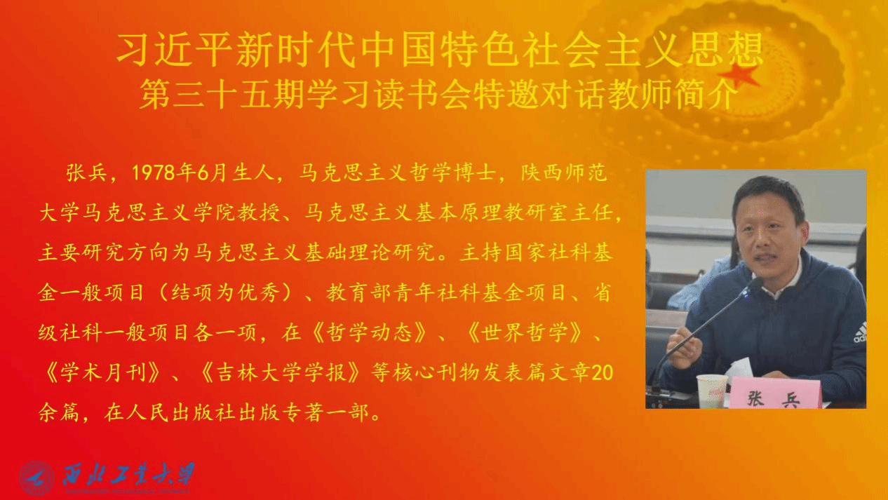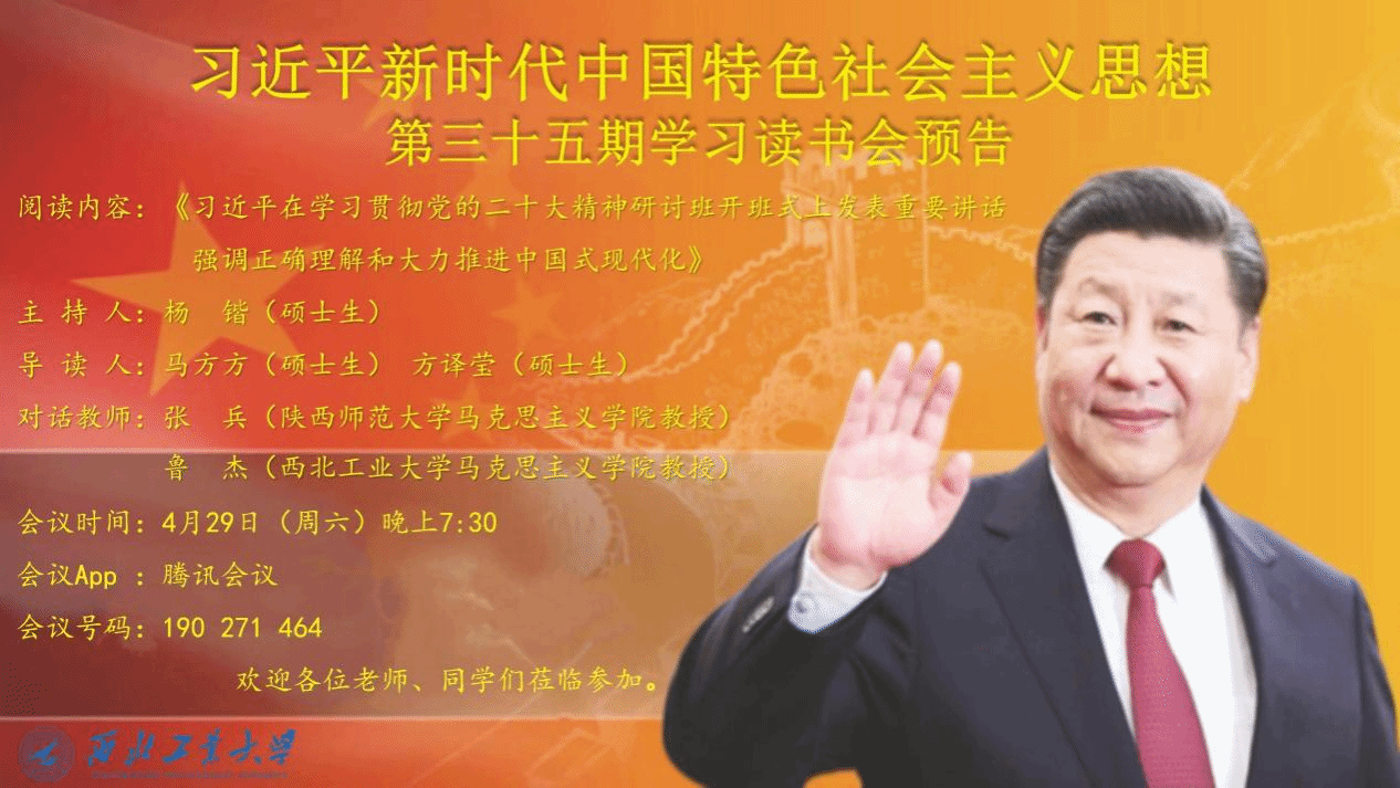 为全面学习贯彻党的二十大精神,推进习近平新时代中国特色社会主义思想进教材、进课堂、进头脑。2023年4月29日,西北工业大学马克思主义学院习近平新时代中国特色社会主义思想学习读书会第三十五期活动主题围绕《习近平在学习贯彻党的二十大精神研讨班开班式上发表重要讲话强调正确理解和大力推进中国式现代化》进行学习研讨。本次读书会由学院思想政治教育系主任、博士生导师鲁杰教授发起,学院硕士生杨锴主持,陕西师范大学马克思主义学院马克思主义基本原理教研室主任张兵教授作为对话教师应邀参加。