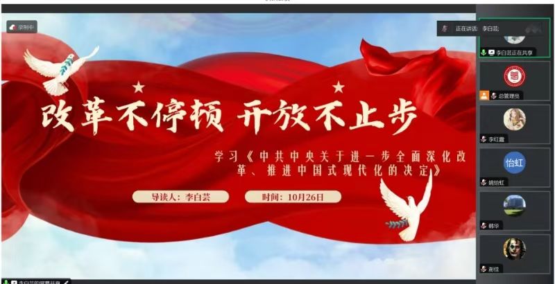 2024年10月26日,西北工业大学马克思主义学院习近平新时代中国特色社会主义思想学习读书会第四十九期活动以“党的二十届三中全会《中共中央关于进一步全面深化改革、推进中国式现代化的决定》”为主题进行学习研讨。本次读书会由马克思主义学院鲁杰思政课工作室主办,首都师范大学马克思主义学院韩华教授作为对话教师,硕士生张转转同学主持,通过线上交流的形式,为师生们搭建了一个思想交流、智慧碰撞的平台。