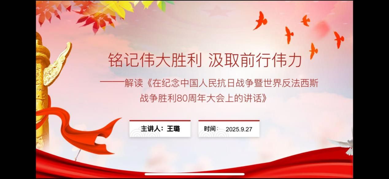 接着,西北工业大学马克思主义学院博士生王璐同学以《铭记伟大胜利 汲取前行伟力》为题,从深刻昭示东方主战场与世界正义的胜利丰碑;深情礼赞民族脊梁与不朽精神的光辉史诗;精辟总结历史启迪与面向未来的宝贵经验;时代召唤铭记历史、共创未来的庄严宣言,四个板块对讲话内容进行了深入浅出地解读。她认为《习近平在纪念中国人民抗日战争暨世界反法西斯战争胜利80周年大会上的讲话》深刻阐释了抗战胜利的伟大意义,深情礼赞了中华民族的英勇抗争,精辟总结了历史经验,并向世界发出了维护和平、共创未来的时代强音。