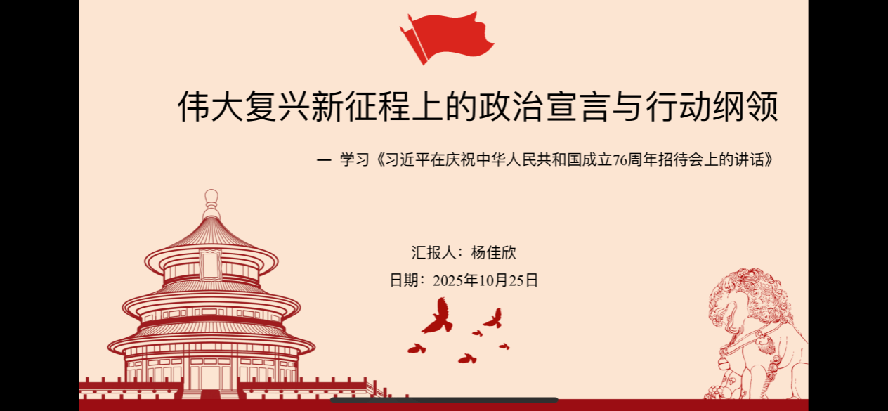 接着,硕士生俞思颖同学对《习近平在庆祝中华人民共和国成立76周年招待会上的讲话》从党的二十届四中全会、“十五五”规划、“四大全球倡议”三个方面进行了深入浅出的解读。党的二十届三中全会,审议通过《中共中央关于进一步全面深化改革、推进中国式现代化的决定》;“十四五”期间的发展成果从创新、协调、绿色、开放、共享五个方面进行了具体的分析和总结;最后,解读了全球发展、全球安全、全球文明、全球治理四大倡议,强调通过这些倡议推动构建人类命运共同体,应对和平、发展、安全、治理“四大赤字”。