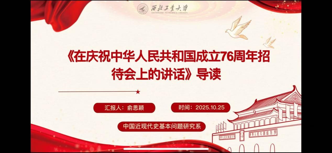 读书会伊始,西北工业大学马克思主义学院博士生杨佳欣同学在认真研读《习近平在庆祝中华人民共和国成立76周年招待会上的讲话》基础上从三个部分对其进行了解读。“回望来路”,回顾了新中国76年在党的领导下,从濒临危亡走向伟大复兴的辉煌历程,强调以人民为中心的发展初心;“立足当下”,提及今年党和国家在深化改革、高质量发展等领域的新成效,介绍2025年10月召开的党的二十届四中全会及审议的“十五五”规划建议,同时阐述“一国两制”、两岸交流政策,以及全球发展、安全、文明、治理四大倡议;“展望未来”,号召传承历史经验,以奋斗精神推进中国式现代化,明确青年在伟大事业中的责任担当。