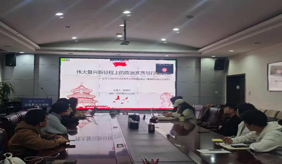 2025年10月25日,中国高等教育学会马克思主义研究分会2025年度“马克思主义经典著作研读”资助计划支持小组——西北工业大学马克思主义学院习近平新时代中国特色社会主义思想学习读书小组第六十一期活动以《习近平在庆祝中华人民共和国成立76周年招待会上的讲话》为主题进行学习研讨。本次读书会由马克思主义学院鲁杰思政课工作室主办,西安电子科技大学马克思主义学院徐礼平教授作为对话教师,西北工业大学马克思主义学院博士生韩藤阁同学主持,通过线上线下相结合的方式,设置线下分会场,邀请导读同学、对话教师、硕博研究生、本科生在学院楼208室交流学习。