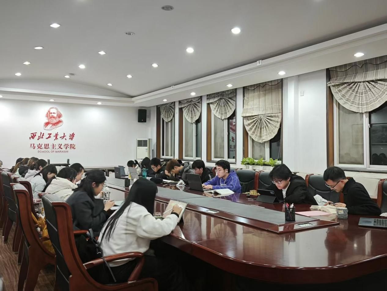 2025年12月6日晚,中国高等教育学会马克思主义研究分会2025年度“马克思主义经典著作研读”资助计划——西北工业大学马克思主义学院“松涛读书会”举行本学期第六次活动。本次活动特邀中国高等教育学会马克思主义研究分会2025年度“马克思主义经典著作研读”资助计划的督导员闫昱澍、杨佳帼参与,共同研读《德意志意识形态》中的《关于费尔巴哈的提纲》部分,并就类本质、共同体及所有制等核心概念进行了深入探讨。