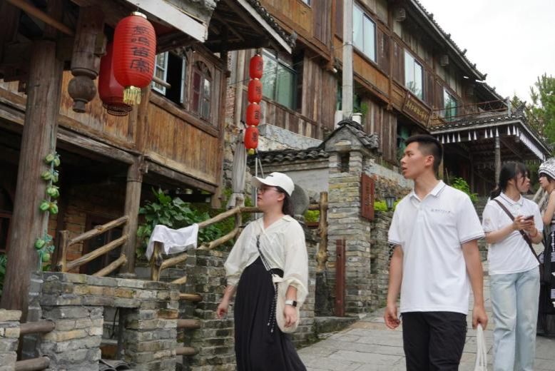 7月11日下午,实践队员们刚踏入梦呜苗寨,就被这里独特的苗族文化和美丽的风景所吸引。梦呜苗寨作为易地搬迁后保存最完好的纯木结构苗族古寨,可谓是“原汁原味”,古寨的建筑风格和服饰上的每一细节都传递着浓厚的历史和文化气息。传统的苗族服饰和精美的银质饰品立刻引起了大家的兴趣,“这些服饰和饰品不仅仅是装饰,更是苗族文化的象征。”实践队员说道。期间,队员们与苗寨的居民、游客进行了详细地交流。通过实地调研,实践队员们对苗族文化与旅游业融合发展有了现实性、直观性了解,获得了促进文化传承与旅游发展更好融合的第一手宝贵资料。