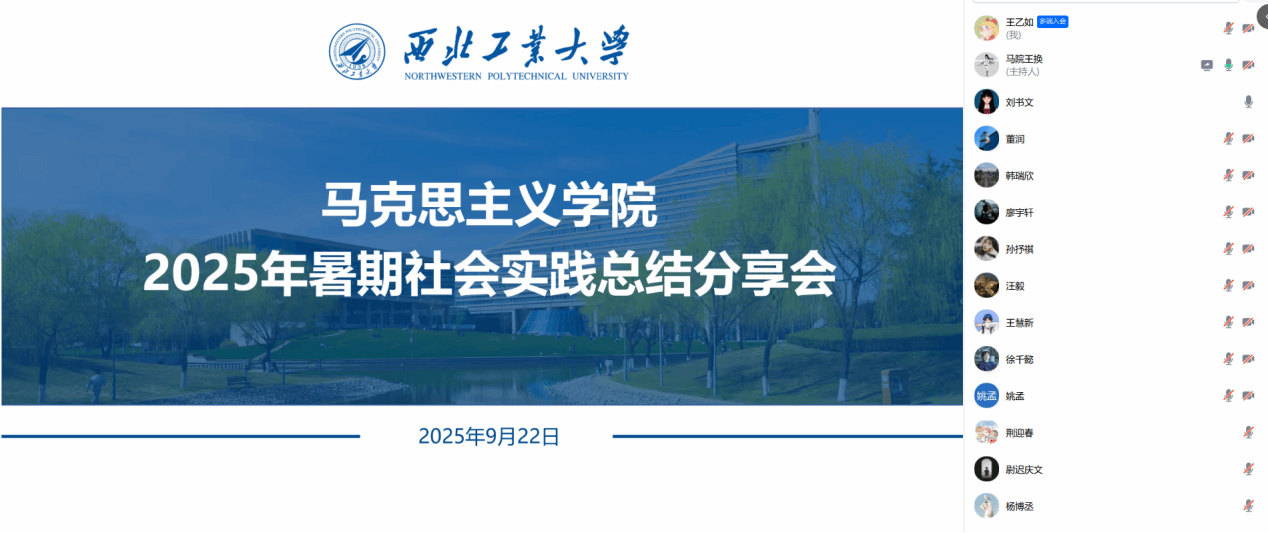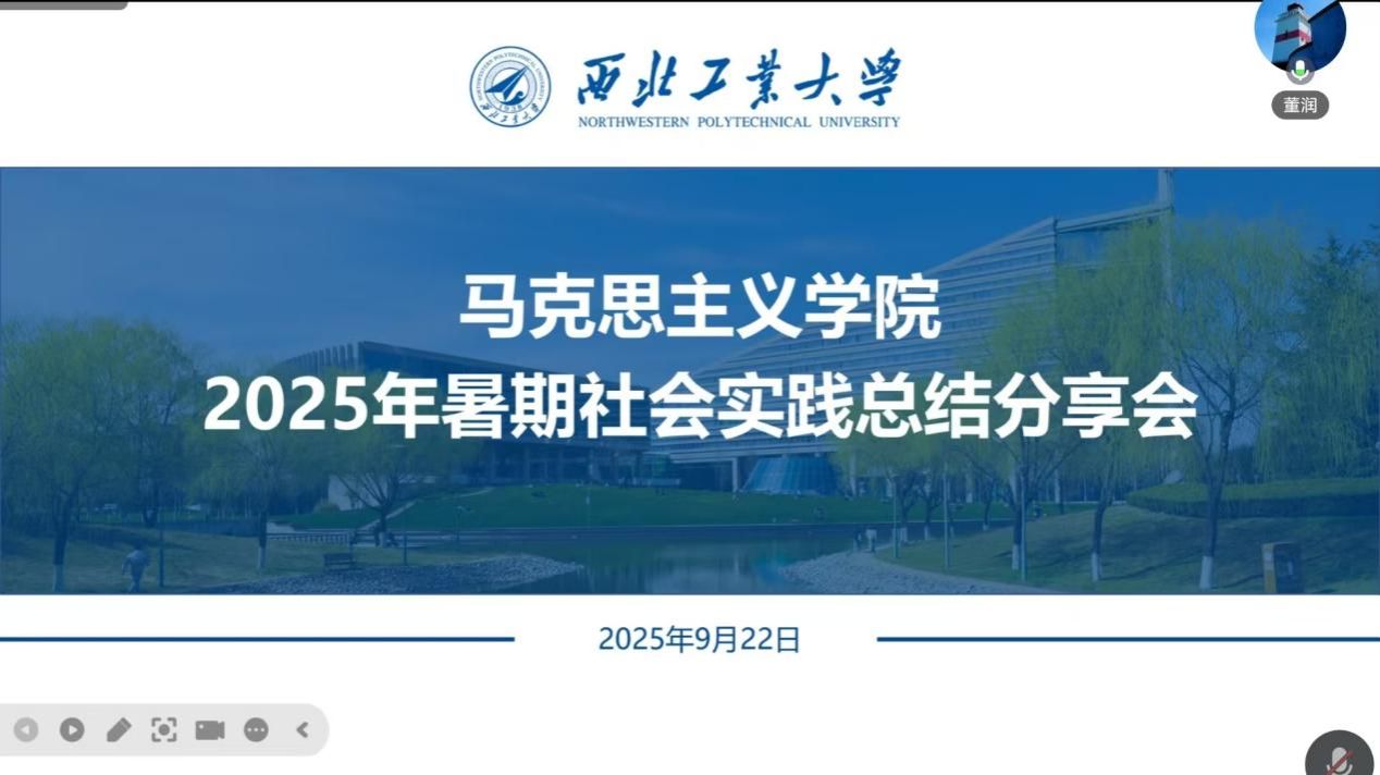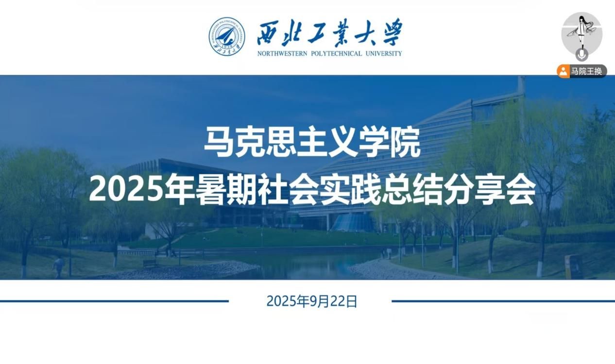 为全面总结暑期社会实践成果,深化实践育人成效,9月22日晚,西北工业大学马克思主义学院通过线上方式成功开展暑期社会实践总结分享会,学院团委书记王换、专职辅导员董润以及各实践队队长与队员代表共同参会。