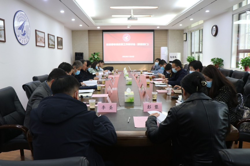 11月4日下午,学校思政课专项改革试点方案研讨会在友谊校区学校办公楼A223会议室举行。学校党委副书记陈建有、发展规划处朱继宏、图书馆侯沛勇、党委宣传部全家悦、人事处王增磊、科学技术研究院李鹏、教务处孙中奎、研究生院李圣、学生处彭蓉及马克思主义学院班子成员参加了研讨会。会议由陈建有主持。