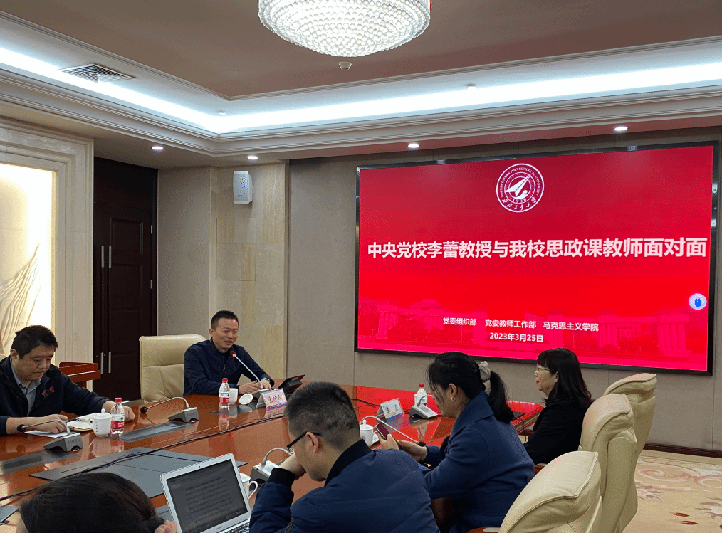 3月25日上午,中央党校李蕾教授与我校思政课教师面对面活动在友谊校区国二会议室召开。本次座谈会在学校党委组织部、党委教师工作部的大力支持下,邀请到中央党校经济学教研部教授、中央党校创新工程执行专家、中央党校经济学部科研秘书,省部级干部培训班主讲教师李蕾教授,同我校思政课教师进行交流座谈。马克思主义学院思政课教师参与座谈会,会议由马克思主义学院党委副书记(主持工作)蒲传新主持。