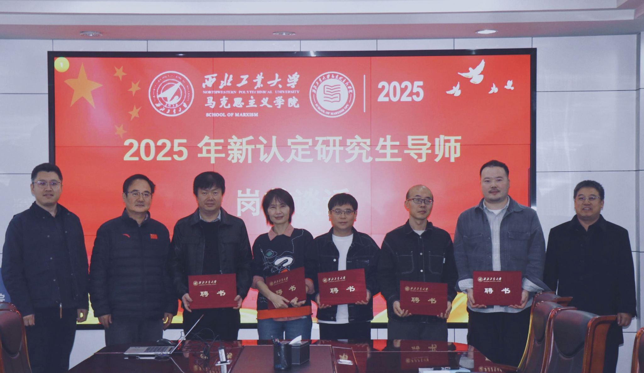 最后,导师岗前谈话工作小组向导师颁发聘书,双方签署《西北工业大学研究生导师岗位责任书》,并合影留念。